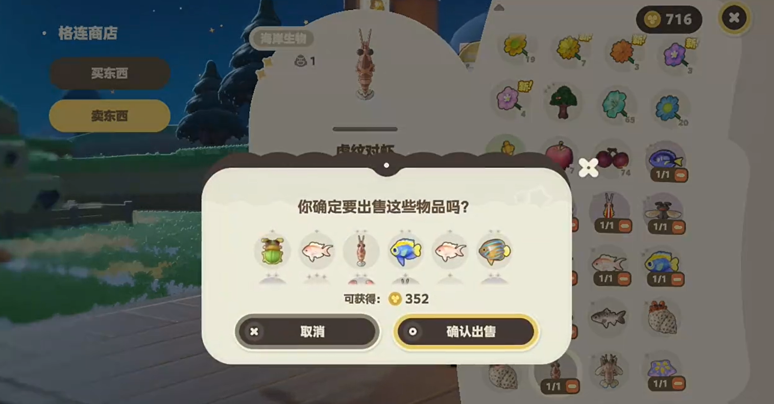 森林里的蝴蝶、萤火虫、金龟子是初期碎钱核心,金属天牛、蓝斑凤蝶等稀有品种售价更高。钓鱼别只盯大鱼,原生鱼、热带小鱼批量出售也能稳定收入。退潮后的沙滩藏着寄居蟹、海胆、扇贝,弯腰拾取就能换钱,刷新频率高且无门槛。
