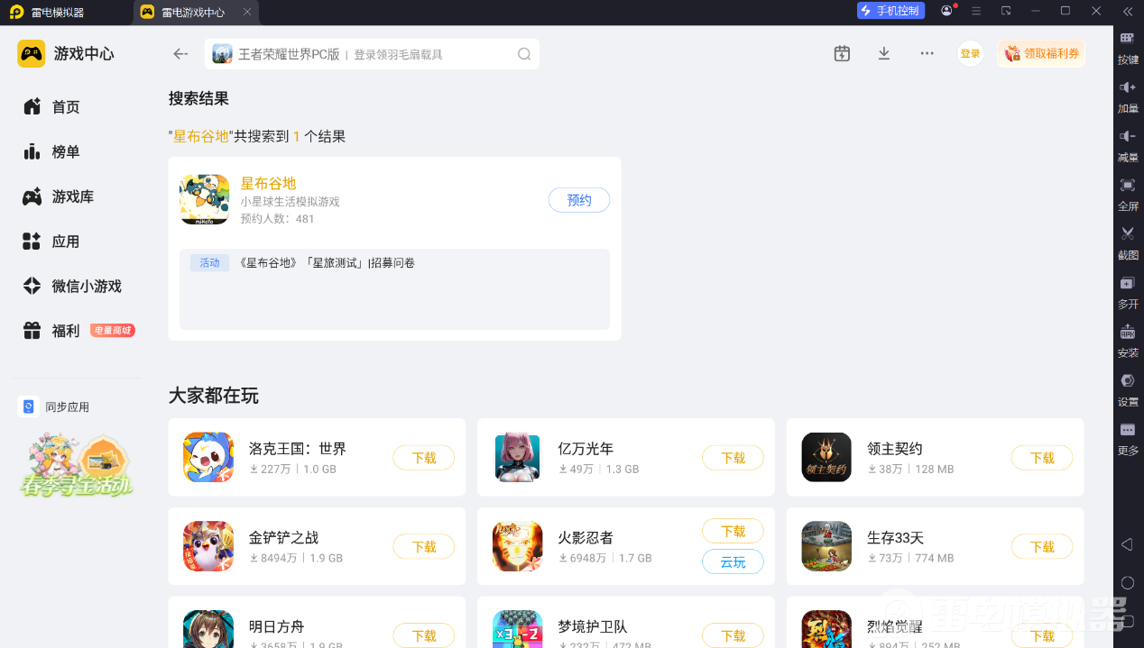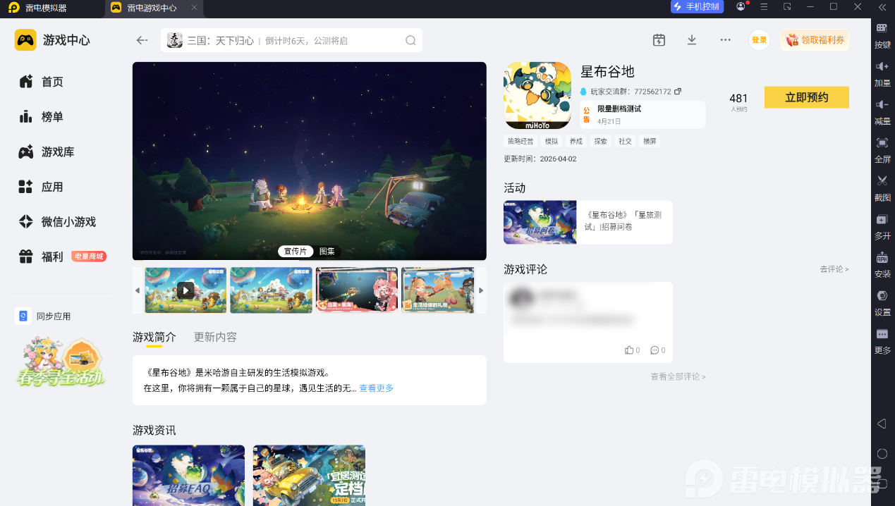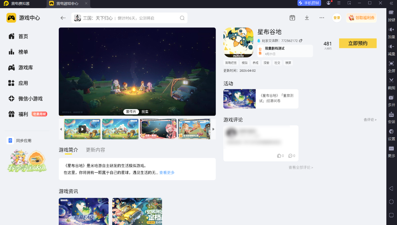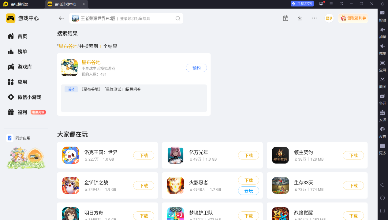 想要获取星布谷地下载入口,可通过雷电模拟器的游戏中心完成预约与下载。雷电模拟器内的游戏中心已收录这款游戏,玩家前往官网下载模拟器,然后在游戏中心搜索“星布谷地”,即可进行预约。当前游戏处于测试招募阶段,提前在模拟器内完成预约,能及时接收下载开启的通知,不错过测试体验机会,为后续顺利进入游戏做好准备。