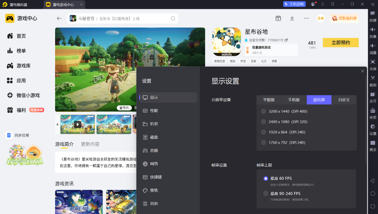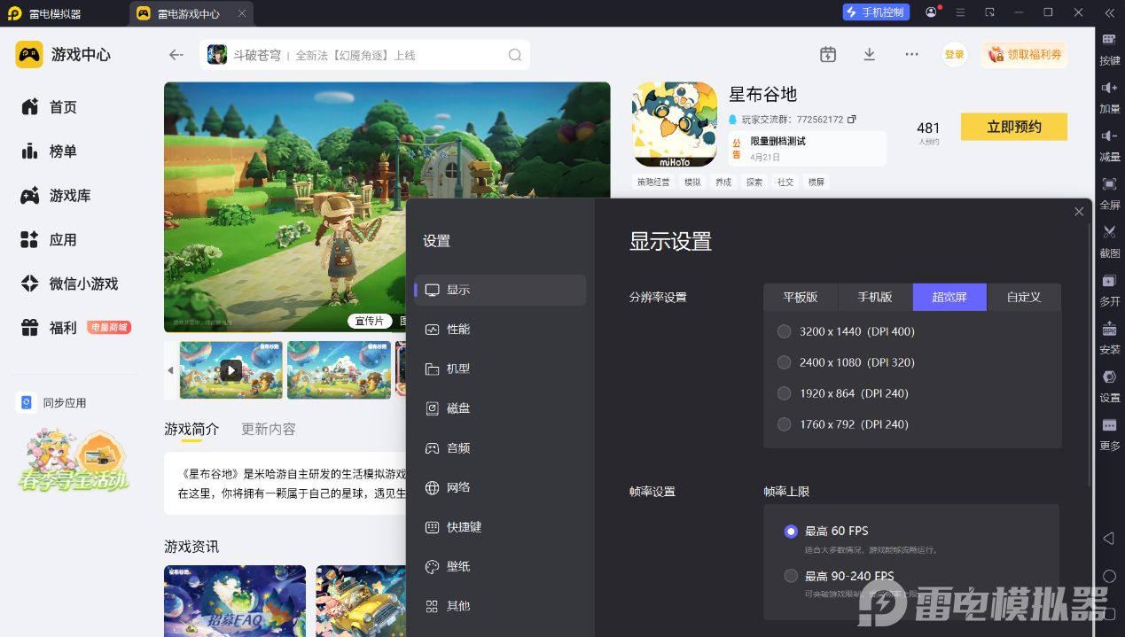 雷电模拟器的超宽屏模式,能为星布谷地带来更优质的视觉感受。游戏中有丰富的星球景观、角色立绘与场景设计,超宽屏可以呈现更多画面细节,让星球的地貌、角色的造型设计更完整地展现。在探索星海或打造家园时,超宽屏能拓宽视野范围,游戏界面的UI不会遮挡核心画面,无论是观赏风景还是进行建造操作,都能获得更清晰的视觉体验,长时间游玩也能保持舒适的观感。