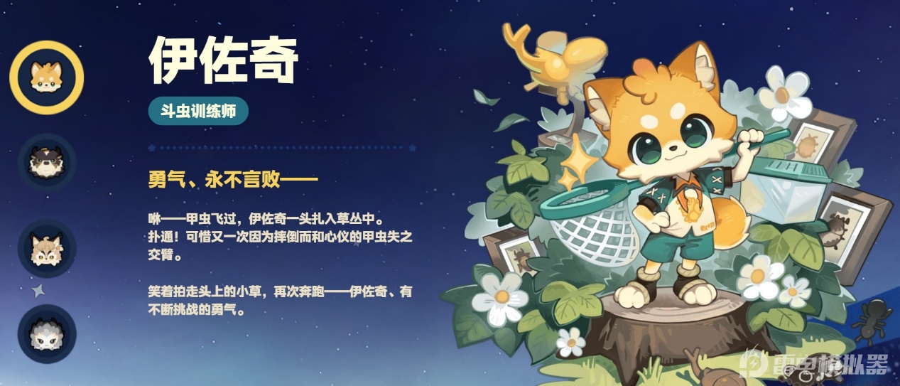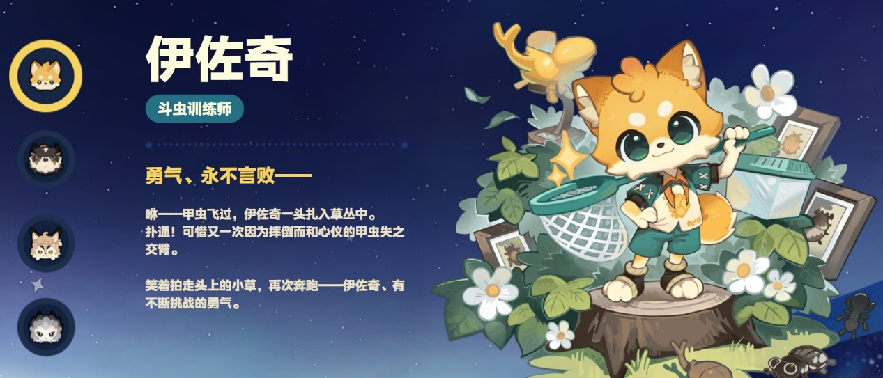 伊佐奇为浅黄色狐狸拟人造型,常身着蓝绿色运动套装,肩头搭着扑虫网,性格乐观且充满活力。他是谷地的斗虫训练师,擅长甲虫捕捉与斗虫培育,会引导玩家掌握昆虫玩法的基础技巧。后续还能解锁昆虫收集、斗虫竞赛等趣味活动,与他互动可学习稀有甲虫的捕捉方法。