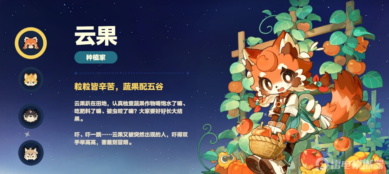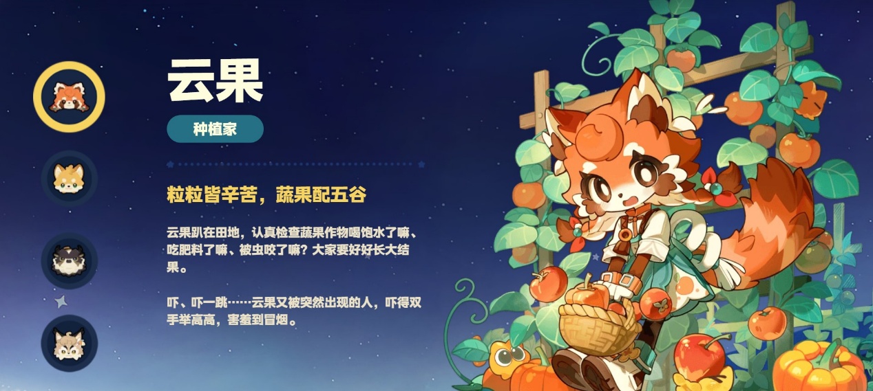 云果是橙色狐狸拟人形象,有着软萌的狐耳与蓬松尾巴,性格腼腆内敛,专注于蔬果培育。她常年在种植园照料各类作物,是谷地的种植行家。和她提升互动好感后,可解锁专属对话与种植相关小故事,还能获得作物生长提速、收成产量提升等园艺增益,对农场经营有明显帮助。
