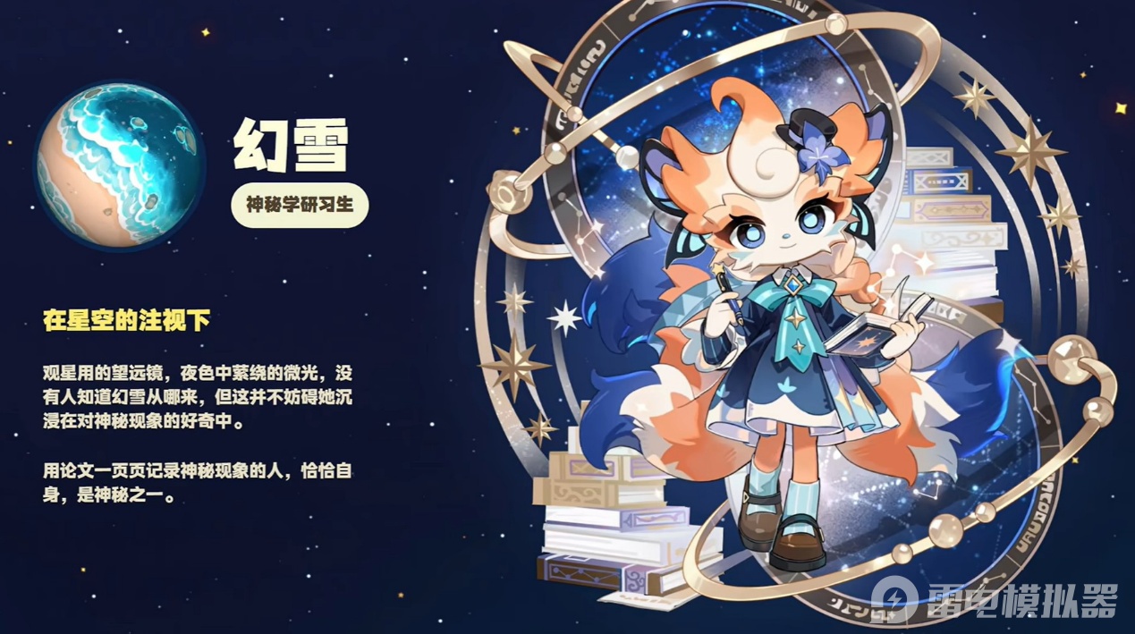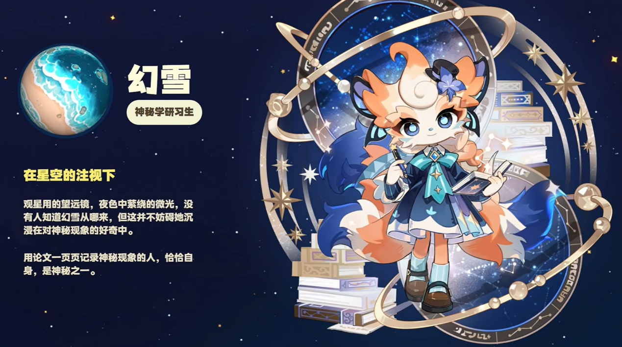 幻雪是九尾狐拟人角色,衣着融合占星与星空元素,气质清冷又神秘。她是神秘学研习生,专注研究星象变化、古老预言等宇宙未知内容,自身来历也藏有秘密。游戏中星象观测、神秘预言相关的内容,都需要和她互动解锁,是推动神秘线内容的关键角色。