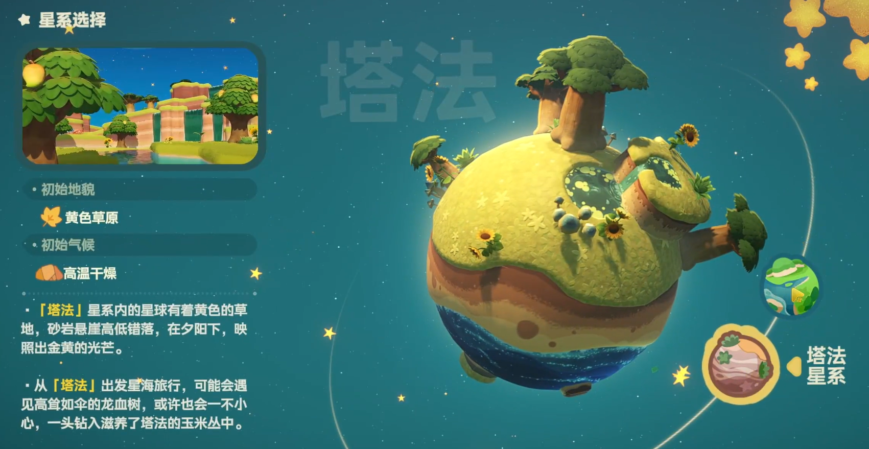 塔法星系整体风格更加荒野化。地图以金黄色草原和砂岩地貌为主,地形起伏明显,经常会遇到陡坡和悬崖。初始作物是小麦,适合种植在旱田环境中。不过由于这个星系雨水较少,大多数时候需要手动浇水。资源方面,这里主要生长芒果树,砍伐后会获得热木和芒果。热木在后期建筑升级中用途很大,因此很多喜欢收集材料的玩家会选择这个星系作为起点。塔法星系的专属伙伴是雪豹萨菲里,它的任务通常偏向探索和摄影,这些任务更适合喜欢探索世界的玩家。