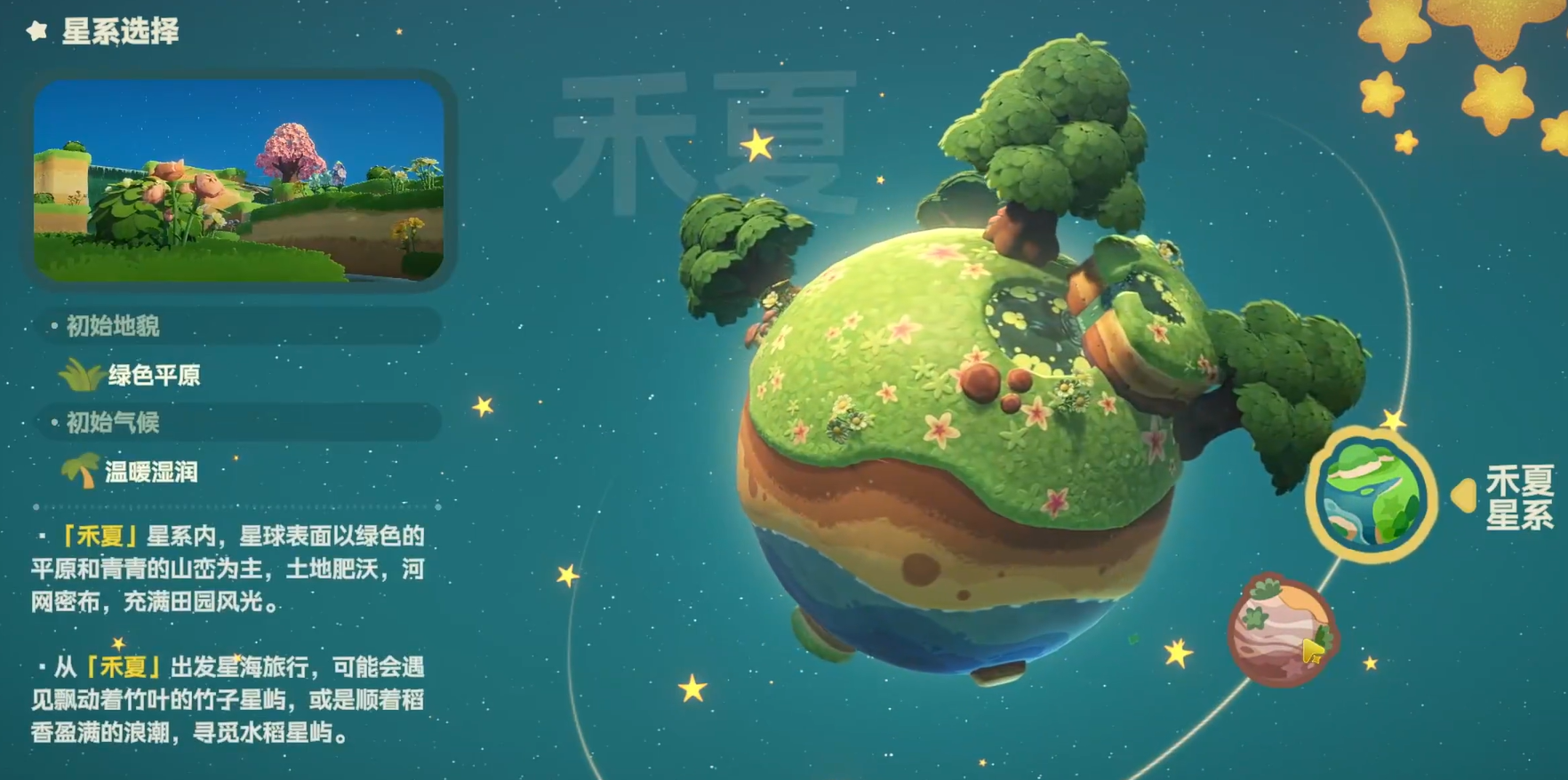 如果是第一次接触生活模拟类游戏,禾夏星系要更容易上手的。星系整体环境是绿色平原与河流组成的水乡地貌,地形比较平坦,很少出现陡坡或悬崖。这个星系雨水较多,水稻种植基本不需要频繁浇水,新手也能轻松维持稳定产量。禾夏星系的初始树木是李子树。砍伐后不仅能获得原木,还能收集李子作为食物补充体力。例如在前期制作工具时,玩家往往需要大量木材,李子树的分布密集能够快速解决材料问题。这里专属伙伴是小柴犬伊佐奇,它的任务通常围绕钓鱼、水田和竹林探索展开。