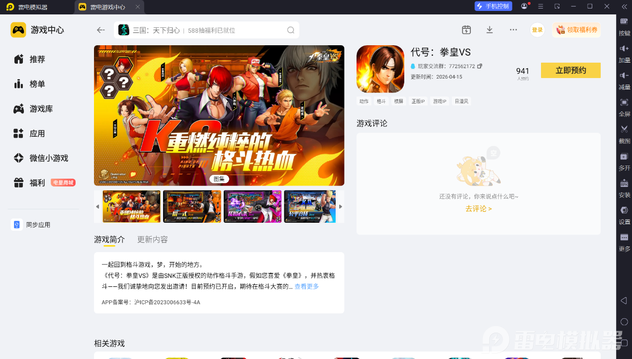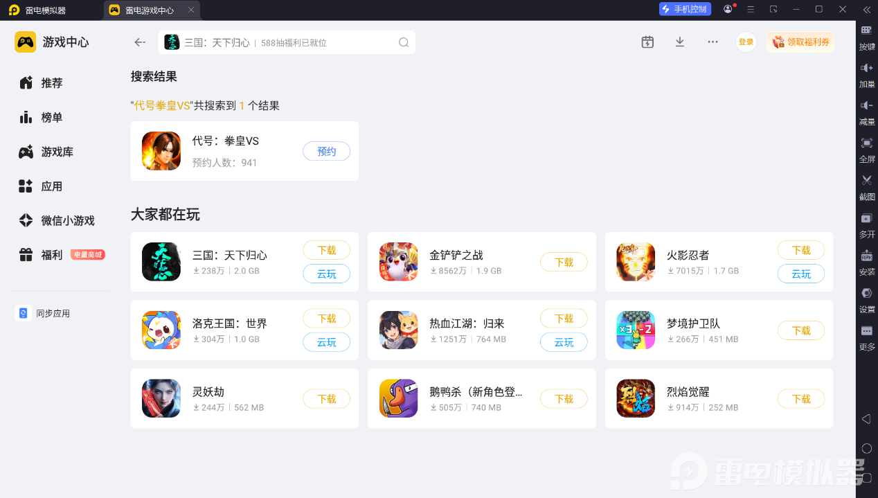 玩家可先前往雷电模拟器官网下载最新版软件,完成安装与基础配置后,打开模拟器内置的游戏中心,在搜索栏输入“代号拳皇VS”,即可完成预约,测试开启后可直接下载安装,快速进入游戏体验格斗内容。