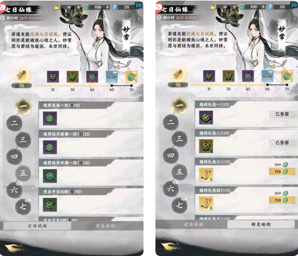 活动分为两部分:七日试炼、特惠抢购;七日试炼即每日的任务,30天内完成即可拿到对应的奖励;特惠抢购即一些打折的道具,免费的就不多说了,需要仙玉的限定绝版道侣东方青禾氪佬必拿!(第四天2288仙玉)其他道具看着买(平民基本可以无视,也可以30天攒2288仙玉买道侣)