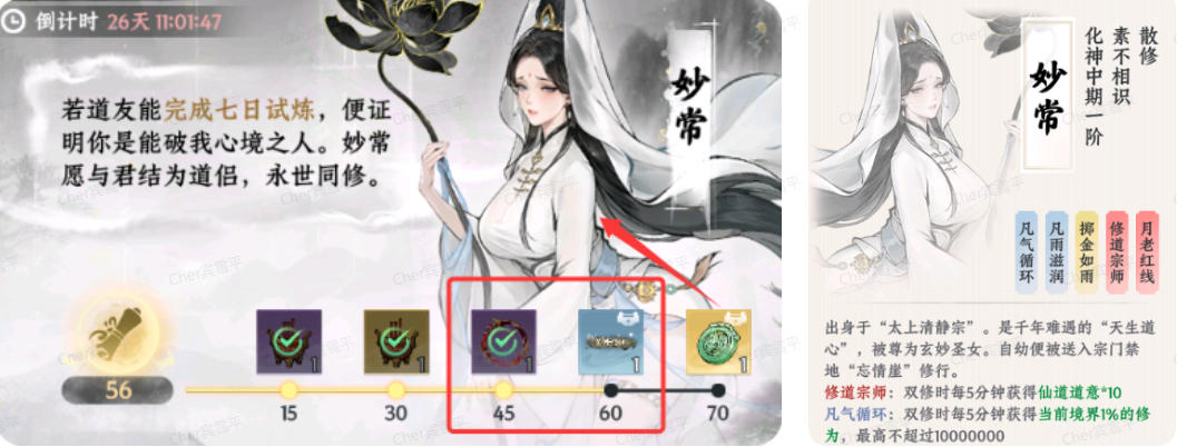 新服活动,时间为30天(足够时间完成所有任务拿到所有奖励),有头像框和头衔,还有限定绝版道侣妙常;尽量前七天拿到,早拿早享受