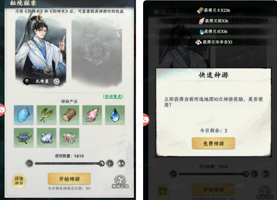 打完历练关卡记得去神游,神游就是扫荡关卡,可以获得很多的材料,包括炼丹炼器材料和升级洞府灵田的(每天的神游次数都是有上限的,正常上限200次,开永久特权卡250次,后续学习奇术也可提升上限;低阶关卡不要浪费太多次数;快速神游留到最后推不动关卡的时候再用,争取收益最大化)