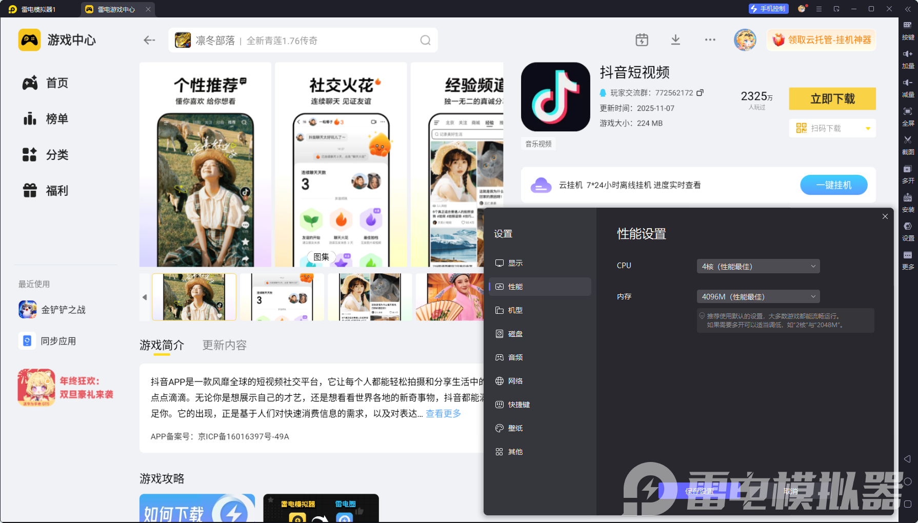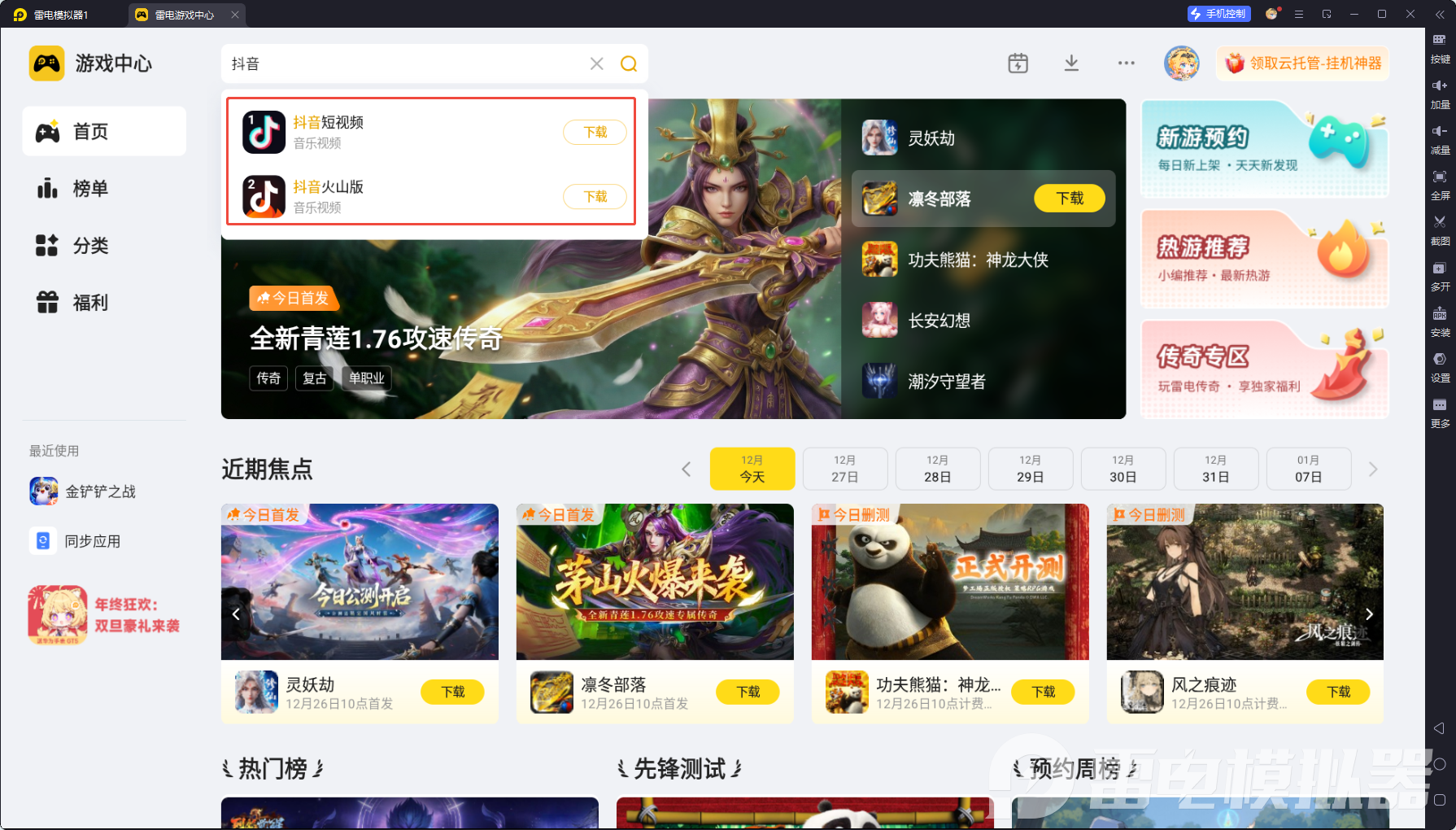 等待安装包下载完成后,双击运行并按照提示完成安装。安装成功启动模拟器后,找到左侧的雷电游戏中心并点击进入,在搜索框中输入“抖音”,此时会同时显示“抖音短视频”和“抖音火山版”两个应用,点击对应应用的安装按钮,等待安装完成后,就能在电脑上正常刷抖音或抖音火山版了。
