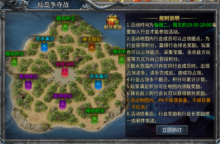 2.活动地图内行会成员可以占领据点,为行会获得积分,赢得行会排名奖励。玩家也可以占领据点、采集宝箱、击杀敌方玩家等方式为自己获得积分。