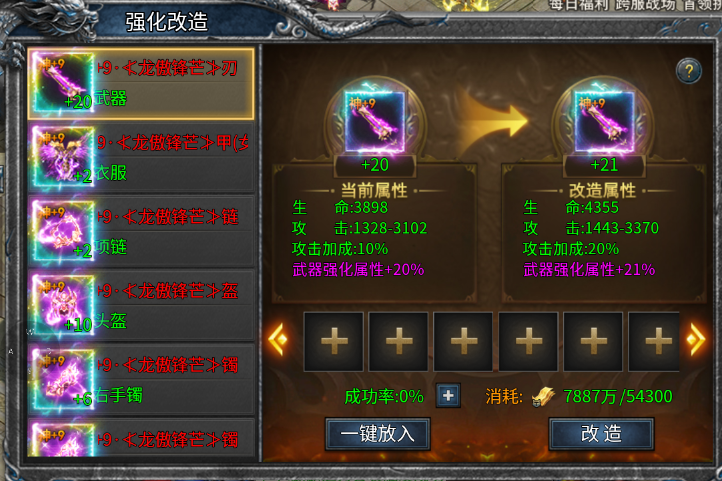 在第八大陆主城中找到改造使者NPC开启改造装备页面,消耗楔形石可提升改造成功率,提升装备改造将会提升大量属性!