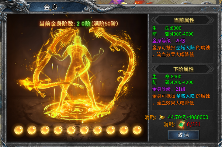 在第八大陆主城中找到圣体使者NPC开启金身系统页面,消耗金身令和元宝可开启金身、提升金身阶层,满阶50阶。提升金身阶数可大幅提升生命和防御属性。