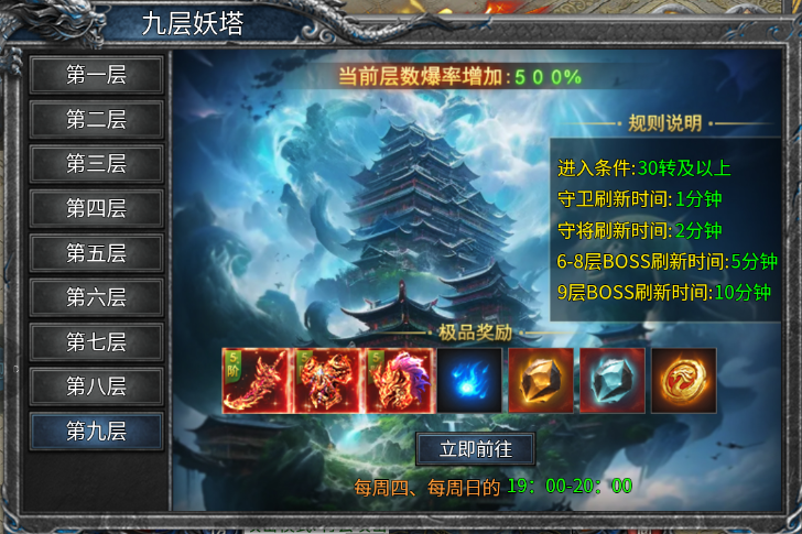 九层妖塔可以获得大量装备、材料,层数越高爆率越高