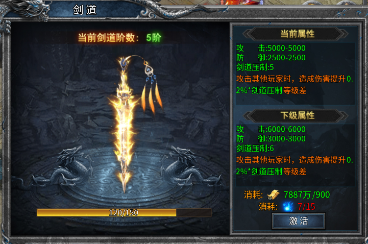 剑道压制可在攻击其他玩家时,造成伤害提升剑道压制等级差一定倍率,在第八大陆主城中找到剑道使者NPC开启剑道页面,消耗剑道之魂和灵符可提升剑道阶数,提升剑道可提升大量攻击,防御以及剑道压制等级。