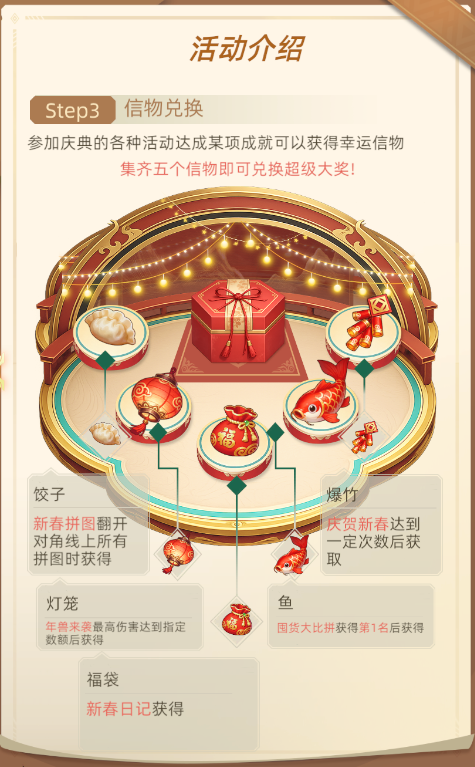 核心目标:Boss最高伤害达500万,可获【信物兑换】道具【灯笼】,与【爆竹】搭配可兑换幸运珍宝、获取珍稀奖励。