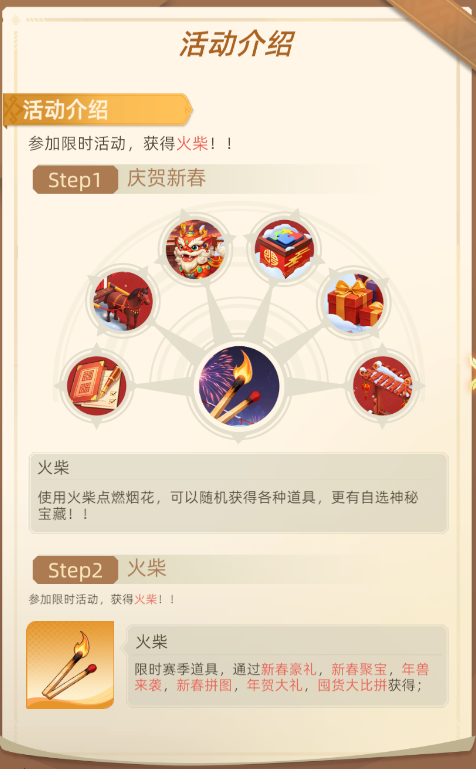 重点提醒:活动结束后火柴自动失效,需及时使用,既能增加抽奖次数,也可参与【庆贺新春排行榜】。该榜以火柴消耗量排名,排名越靠前,活动结束后邮件奖励越丰厚。