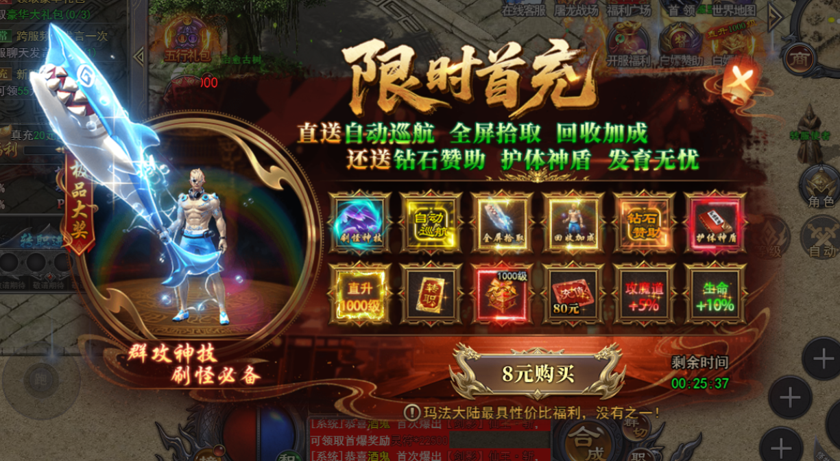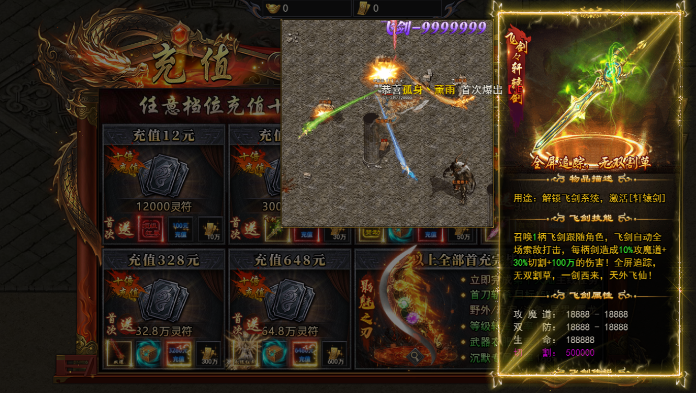 两档首充拿完,群攻神技+自动巡航,解封双手前期发育速度更快30 的直购解锁第一把飞剑,自带贯穿伤害,群怪扎堆时一穿一片,清场效率直接翻倍!