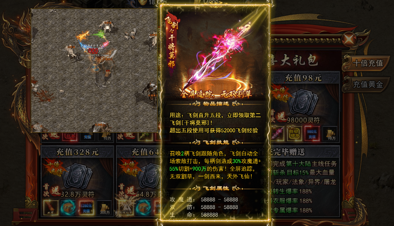 直冲98开启第二把飞剑,直购 30+98 解锁两把飞剑,直升到五段切割继承+55%,飞剑伤害+900w