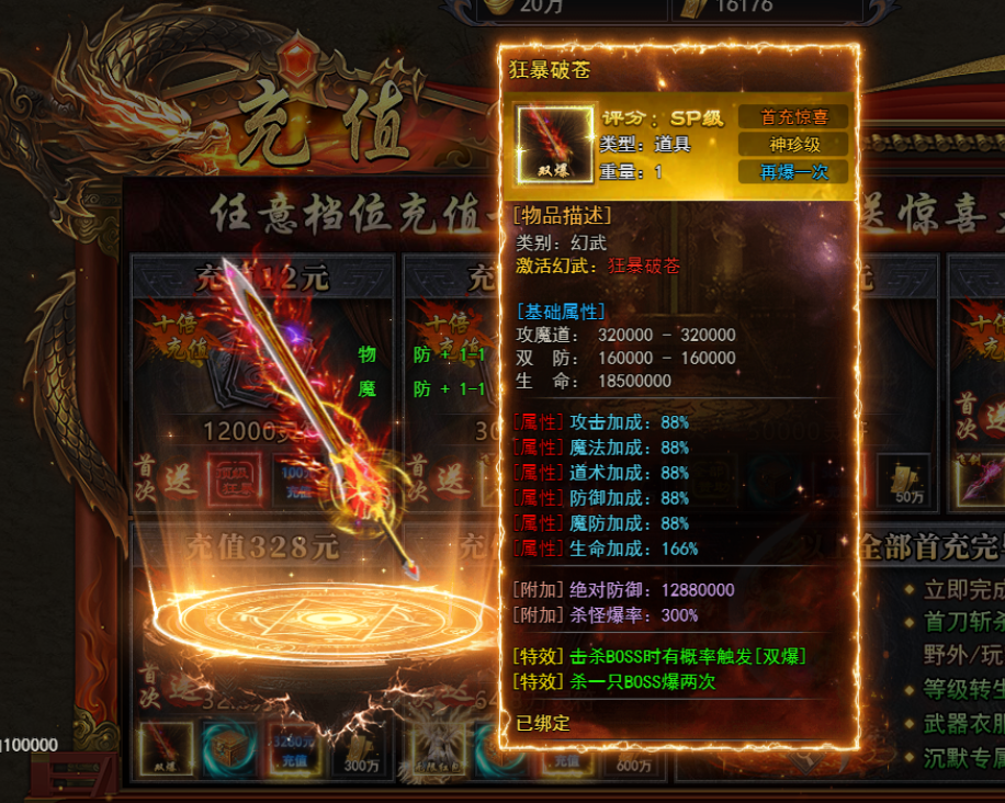 直充328送专属神器狂暴破玄,杀一只BOSS爆两次!