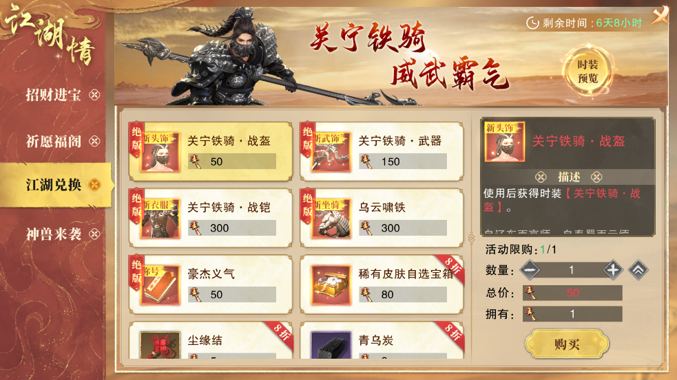祈愿得多倍元宝及全新背饰,珍稀道具与 “关宁铁骑” 限时套装兑换即得。