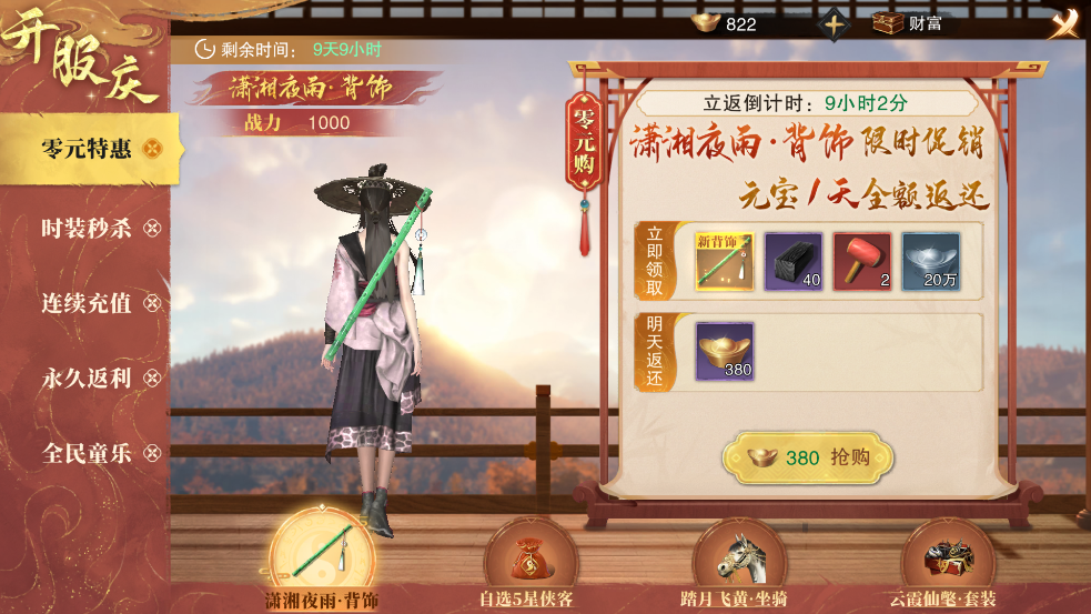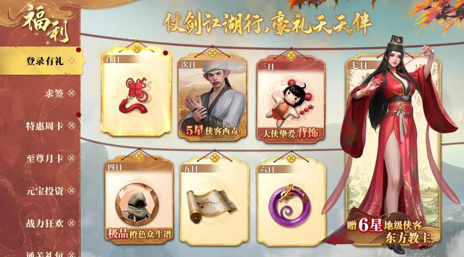 强力5星侠客“西毒”与顶尖6星地级侠客“东方教主” 累登即送,还可免费领取珍稀背饰时装。极大提升战力体验!