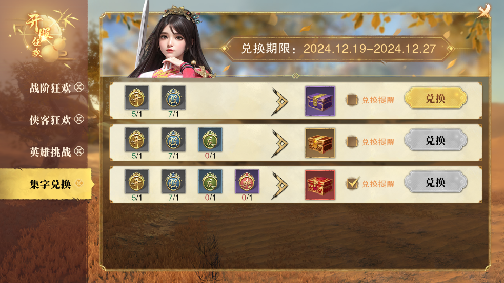 同时,完成集字任务,集齐 “开、服、庆、典” 四字,即可兑换神秘宝箱,海量元宝银两让您的江湖之路再无资源之忧。