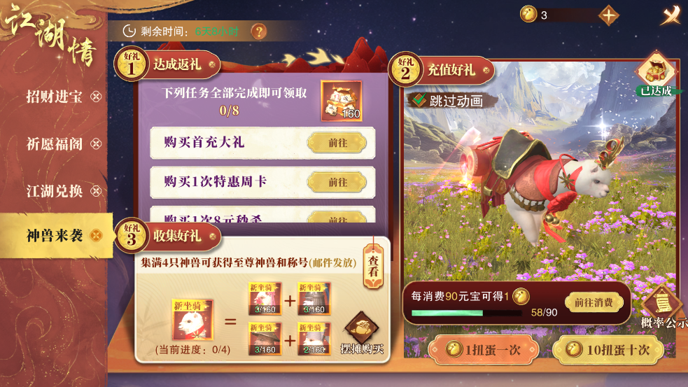 行走江湖,怎能少了坐骑与财运相伴?神秘神兽“羊驼”坐骑震撼来袭!参与扭蛋收集四只灵兽,即可合成至尊神兽并赢得专属荣耀。完成指定任务可加速收集进程,助您早日览尽山河。