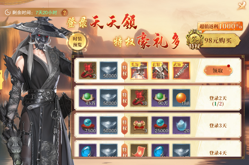 活动内容:活动期间,可领取免费大寒特权;付费购买后,可额外获得特权奖励。可获得绝版时装【星云修罗·面罩】、【星云九幽·战铠】、【星云九幽·武器】。