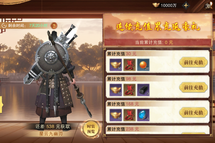 活动内容:活动期间,充值6/30/98/198/328元,返还等额元宝,仅1次机会。需在充值界面的充值档方可触发返还。