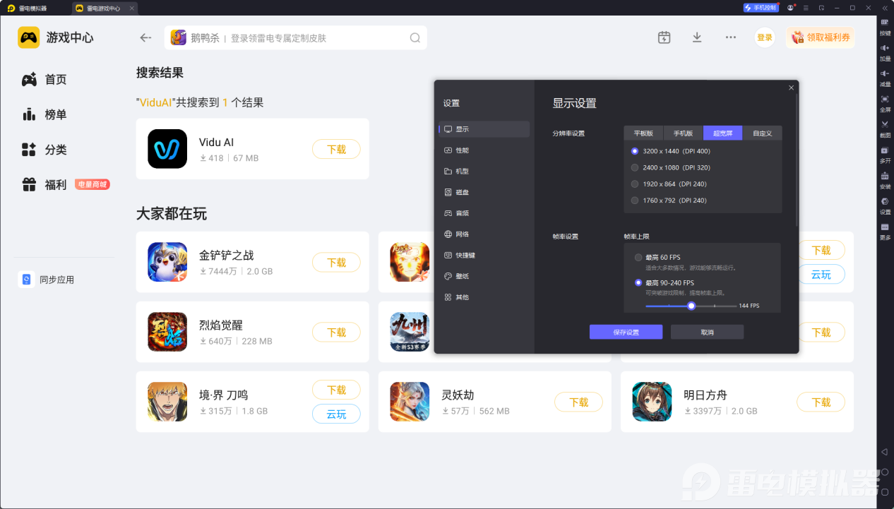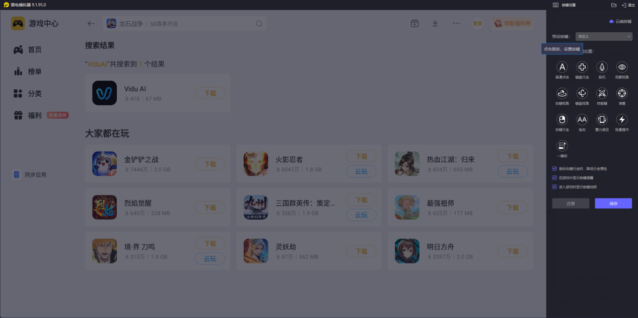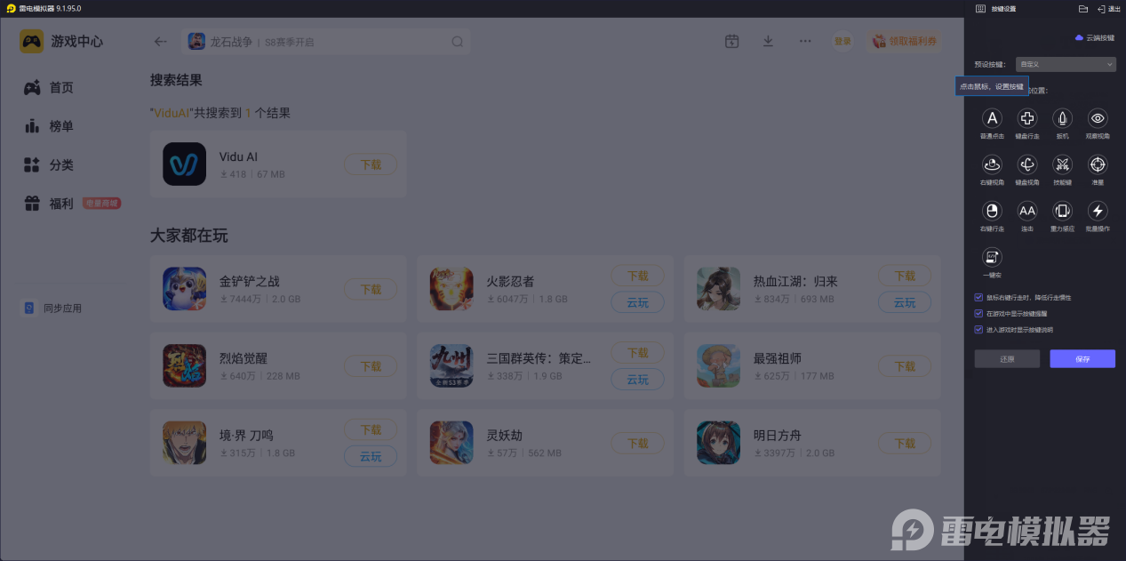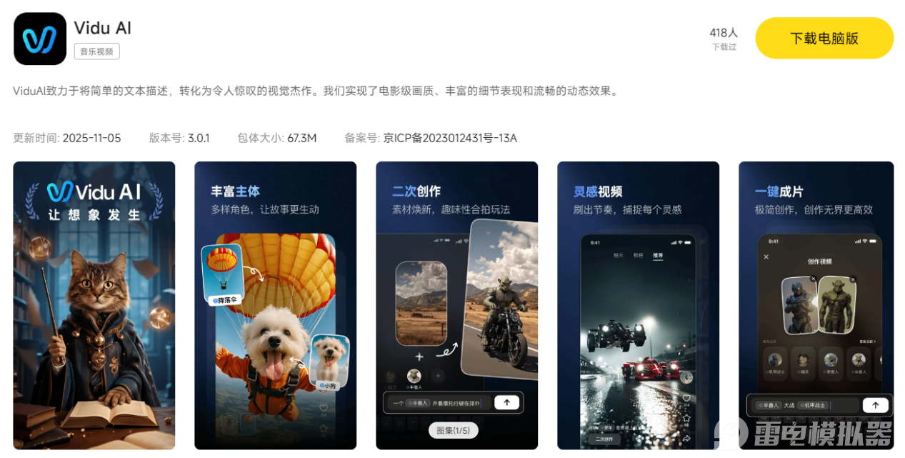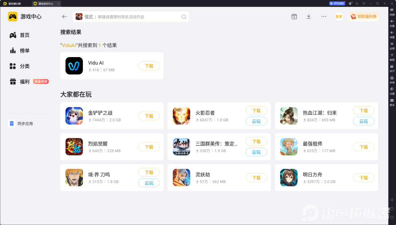 安装并打开模拟器:按照提示完成安装后启动模拟器,在雷电游戏中心搜索ViduAI。下载使用:找到对应的应用后点击下载,安装完成后,即可在电脑上通过ViduAI电脑版开展AI视频创作。