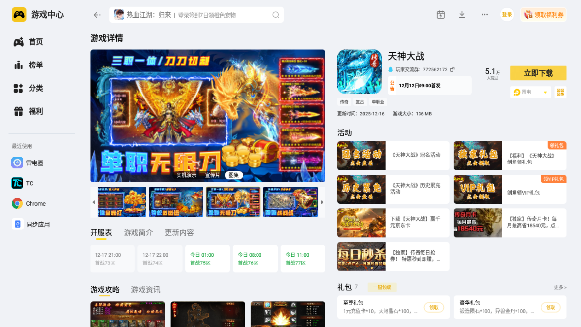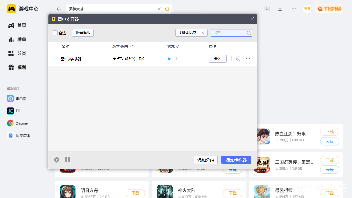 为了能让小伙伴们去通过模拟器的使用来获得更好的体验,其实小编更建议大家去使用雷电模拟器来帮自己,该软件不仅为“天神大战”设立了专区,更是可以去进行下载体验,玩家还可通过专区内的资讯等来了解游戏的最新更新动态情况。