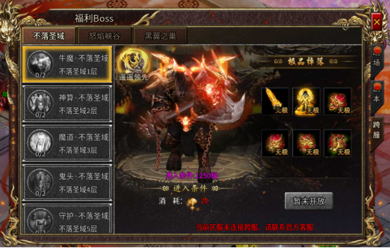 玛法大陆边界异动,空间壁垒破碎,三大上古跨服副本冲破封印现世,新增跨服副本——不落圣域、怒焰峡谷、黑翼之巢,邀各路服务器勇士跨服集结、共闯险关、掠夺至宝!