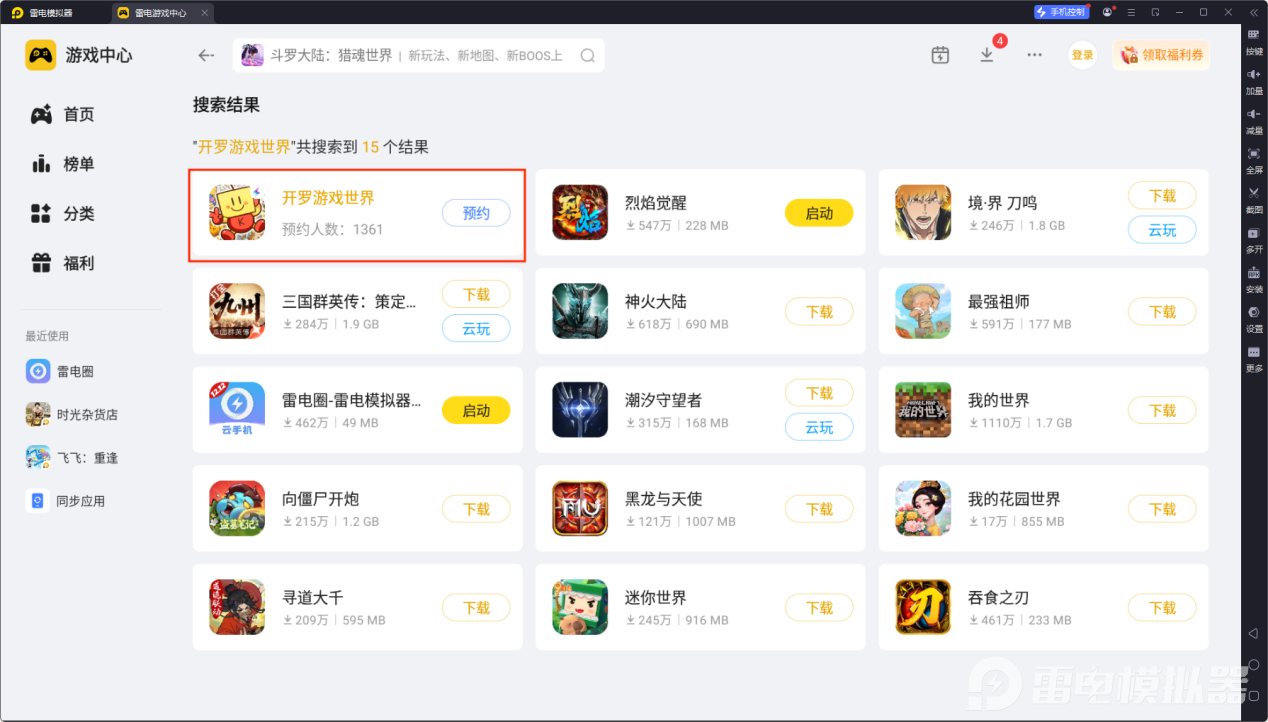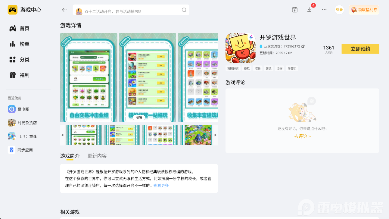 想要快速开启游玩,可直接访问雷电模拟器官网,搜索“开罗游戏世界”,找到对应手游后点击预约即可,等游戏上线的时候,雷电模拟器会自动帮大家下载,非常的方便。