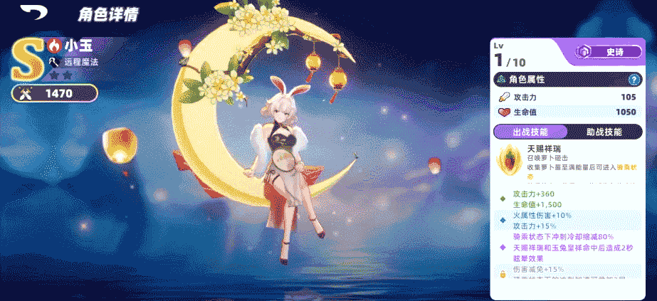 助战技-召唤小玉:骑乘状态小玉围绕出战角色环形冲撞,对撞到的目标造成攻击力230%的伤害,助战12秒,召唤冷却40秒。
