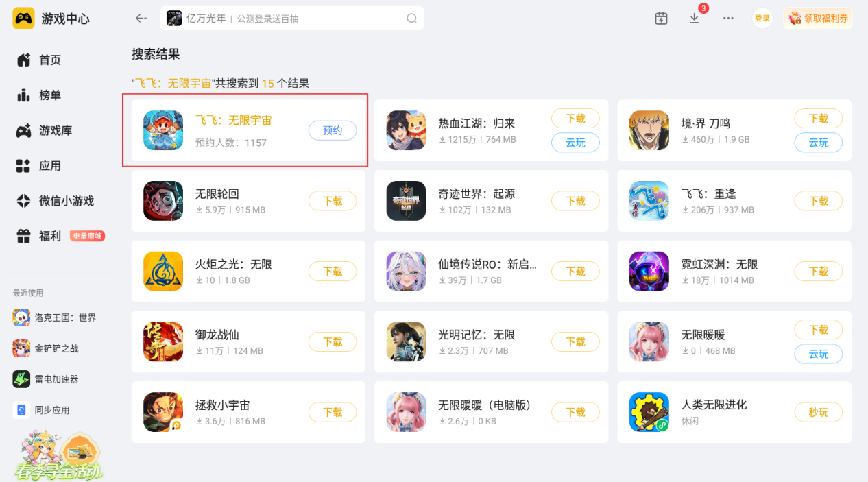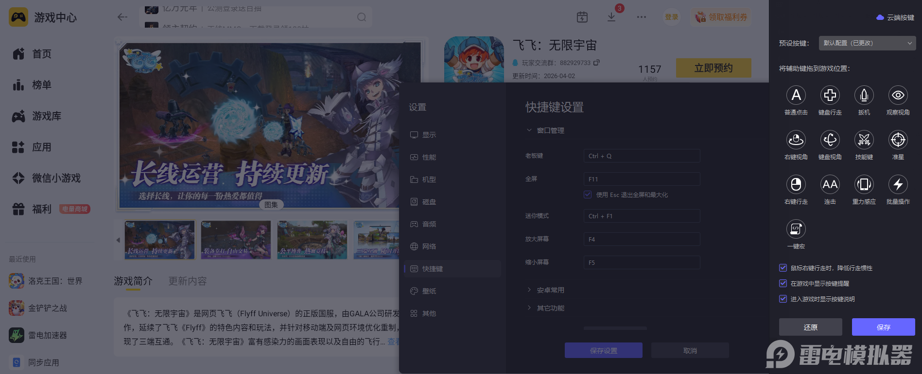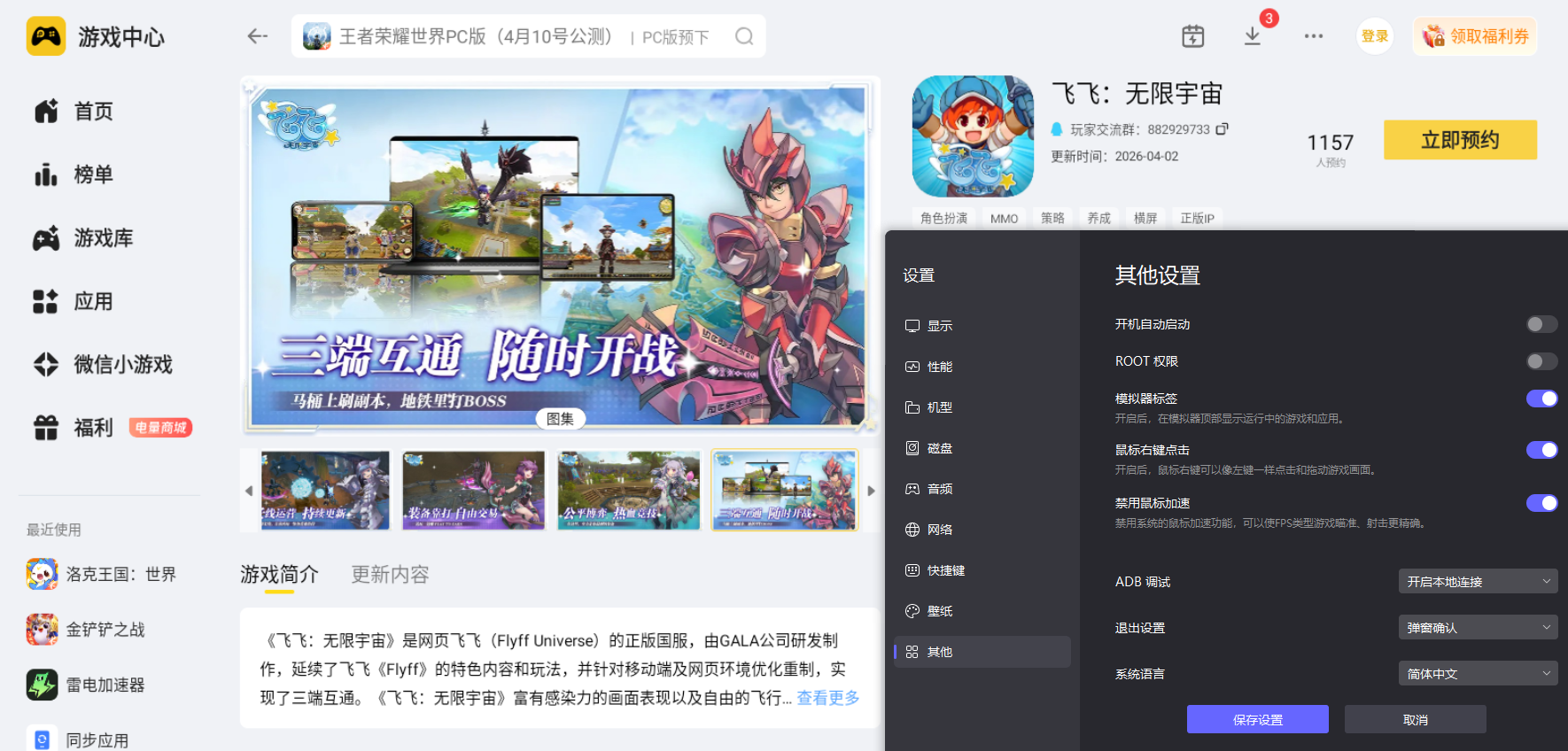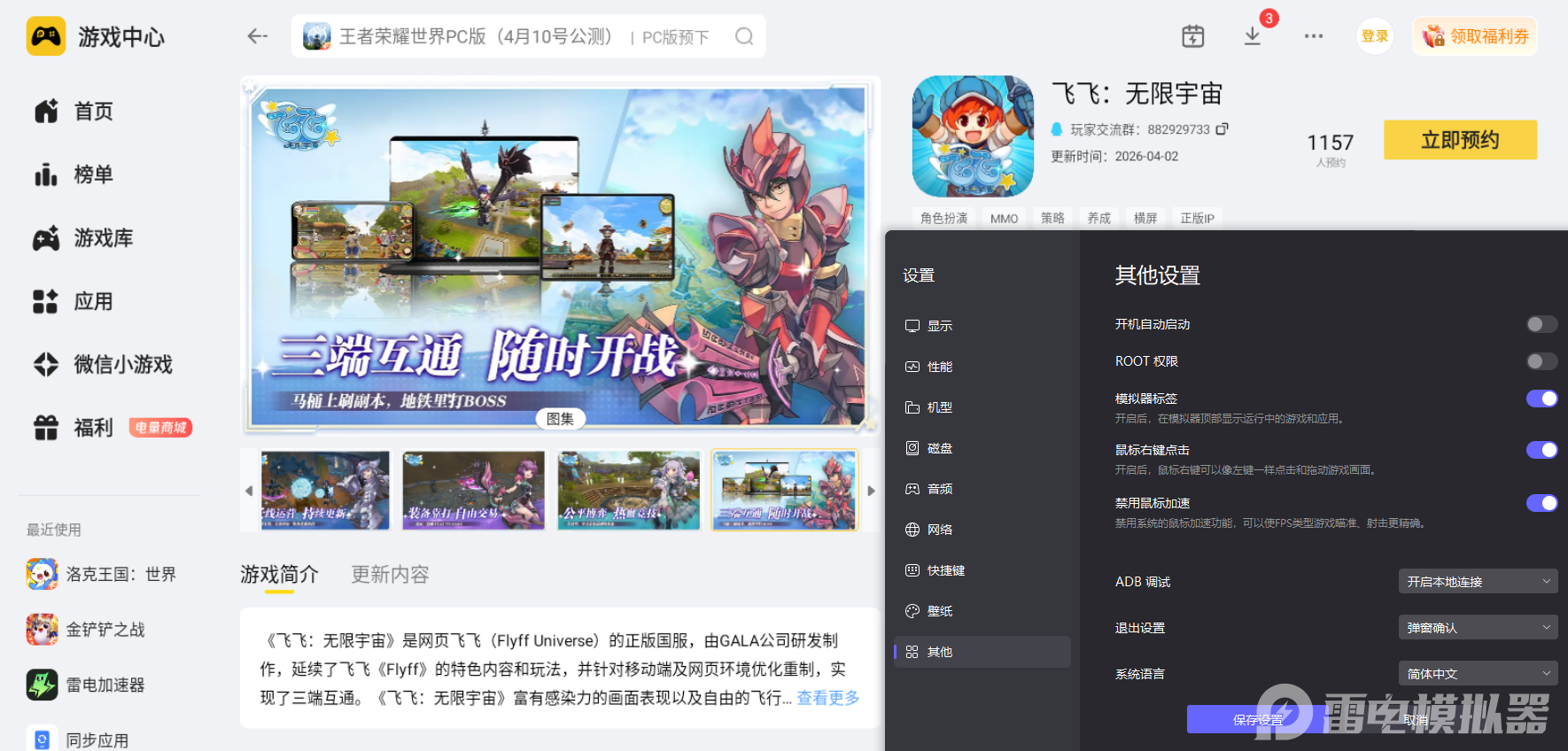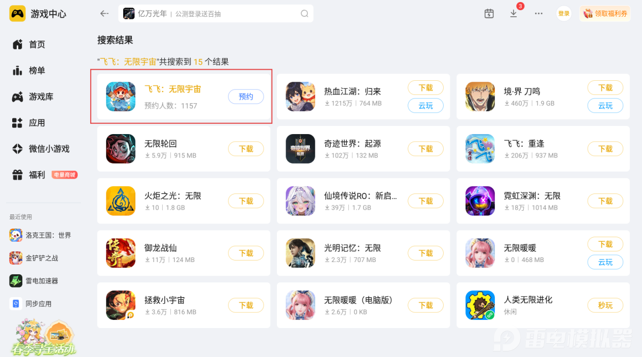 想要在电脑上畅玩这款游戏,可直接前往雷电模拟器官网下载安装包,完成安装后启动模拟器,在雷电游戏中心内搜索飞飞无限宇宙,点击安装即可完成游戏部署,整个操作流程简洁易懂,能快速在电脑上开启星际探索之旅。