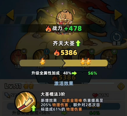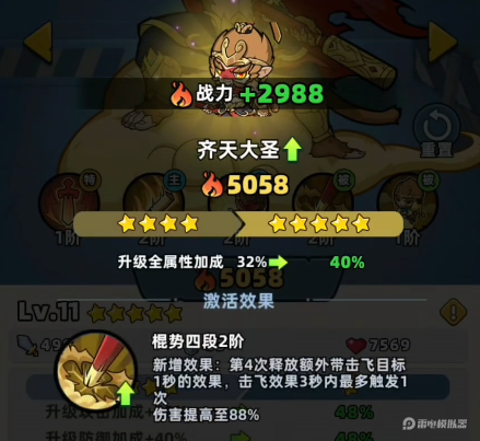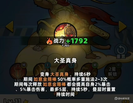 (4)被动技能:1星解锁“棍式四段”,累计4次金箍棒触发强化版伤害,提升55%且攻击3个目标;2星解锁“猴子猴孙”,变身时召唤小猴,累计4次金箍棒触发范围伤害并回血,提升续航能力。