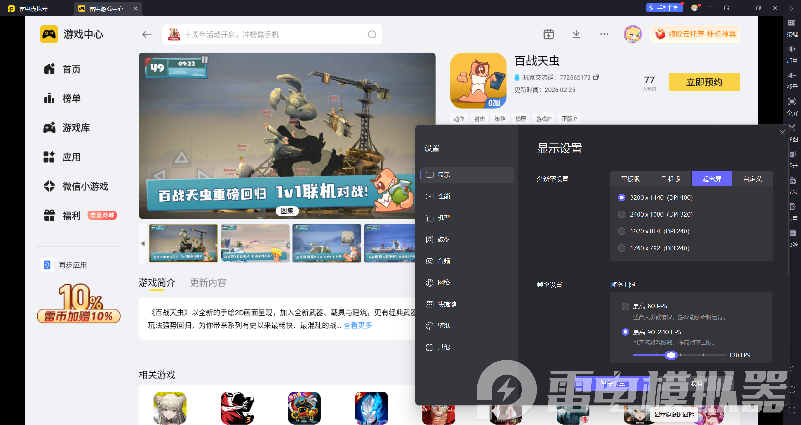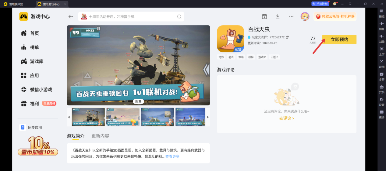 启动模拟器后,在雷电游戏中心搜索百战天虫,找到游戏后点击预约,等游戏上线后下载安装完成就能在模拟器应用列表里启动游戏了。