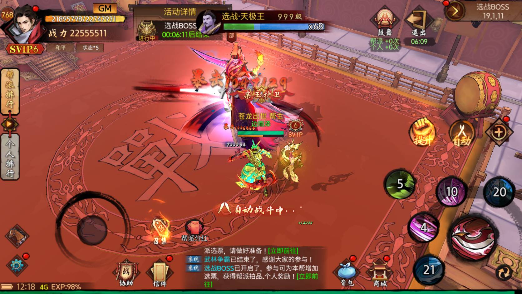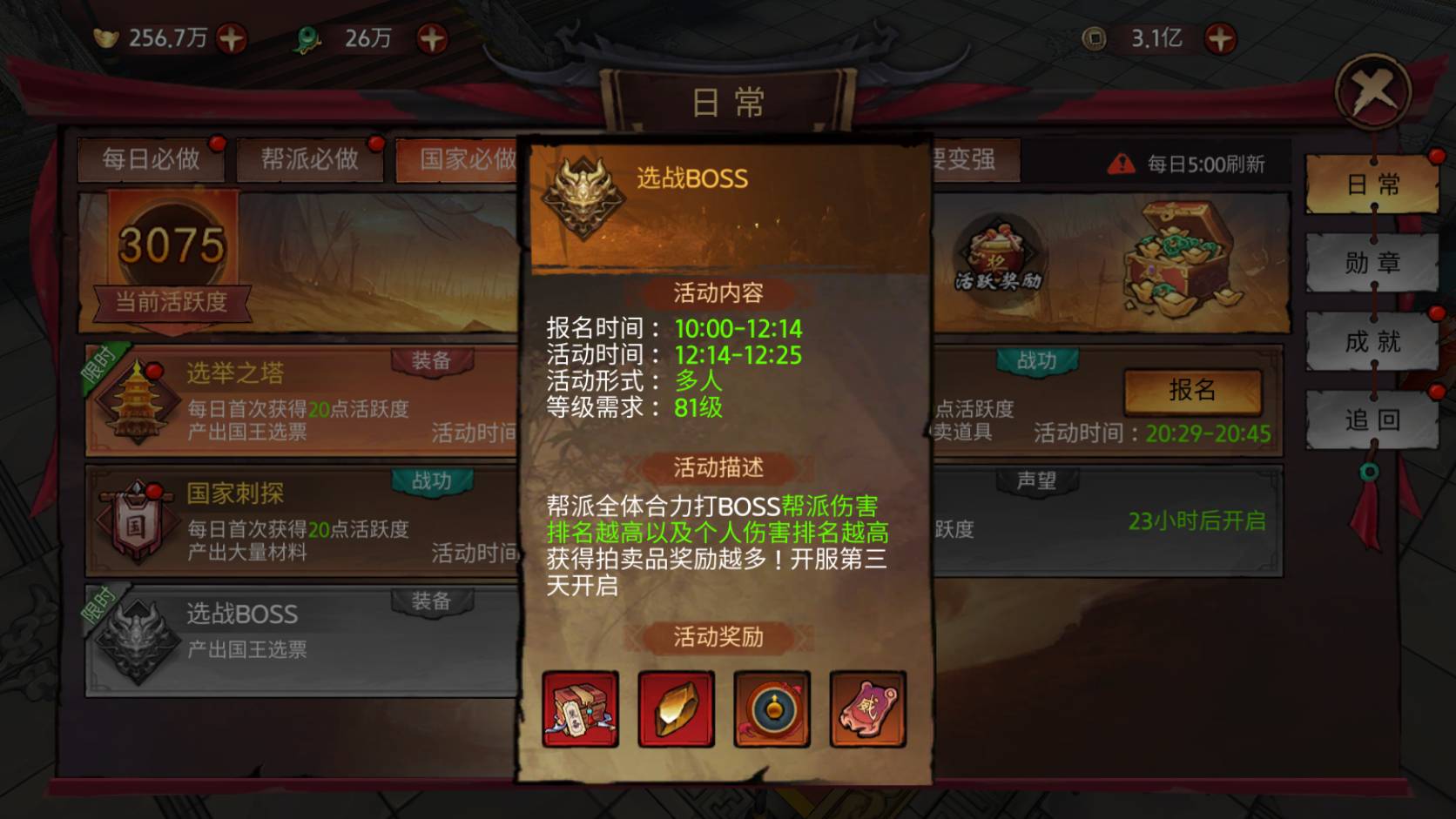 选战BOSS是产出选票的重要来源,我们角色达到81级,同时加入帮派后开启。要求我们在每天早上10:00-12:14完成报名,报名后12:14-12:25选战BOSS登场,我们要在十分钟之内,与其他玩家一起合作完成挑战。