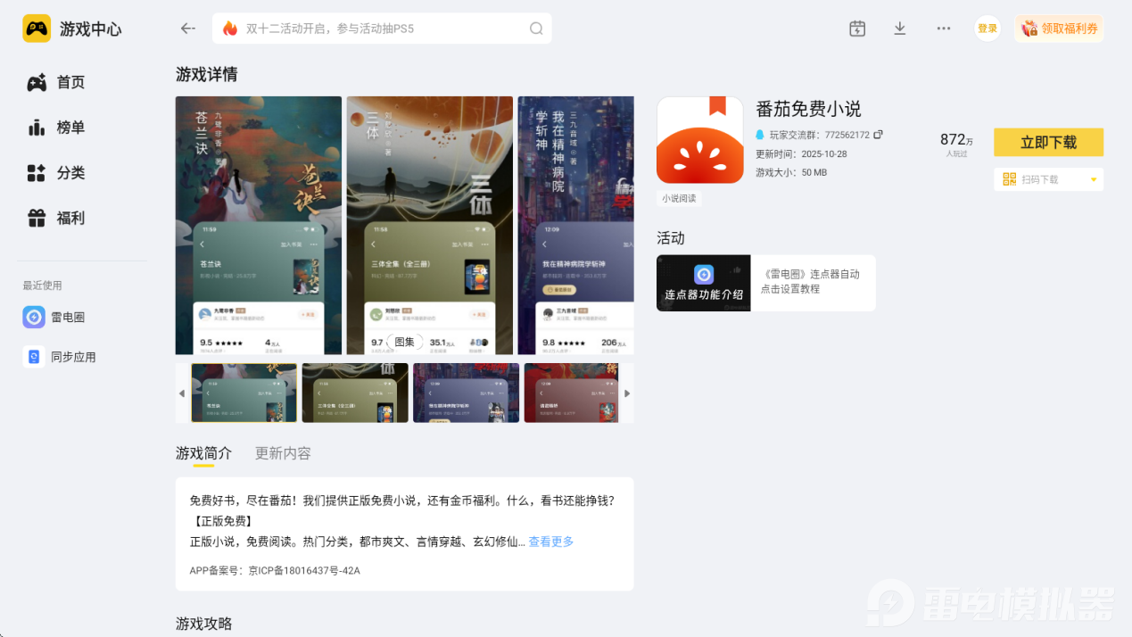 如果大家不仅想阅读,还想在电脑上同时处理其他事,推荐使用雷电模拟器。它能在电脑上搭建安卓运行环境,就像一个“虚拟手机”,只要在模拟器里搜索安装番茄小说,就能轻松实现电脑版番茄小说的阅读体验,而且比单纯的PC端更灵活。