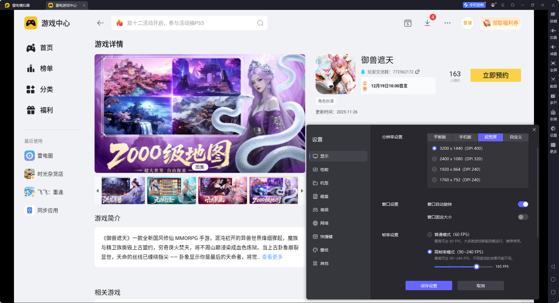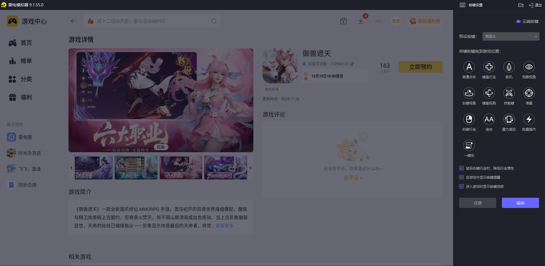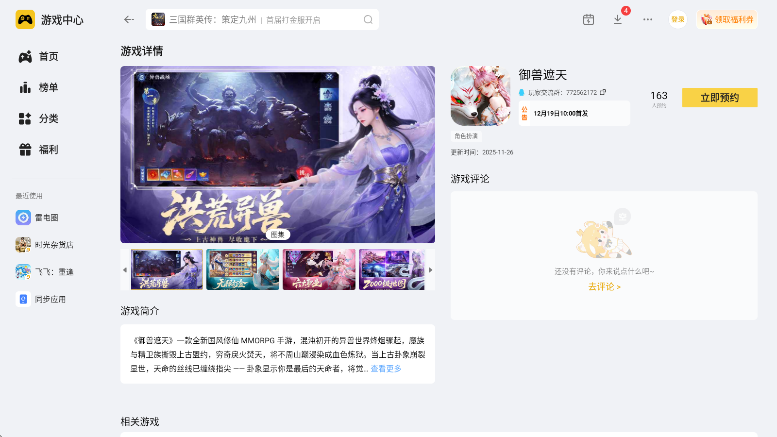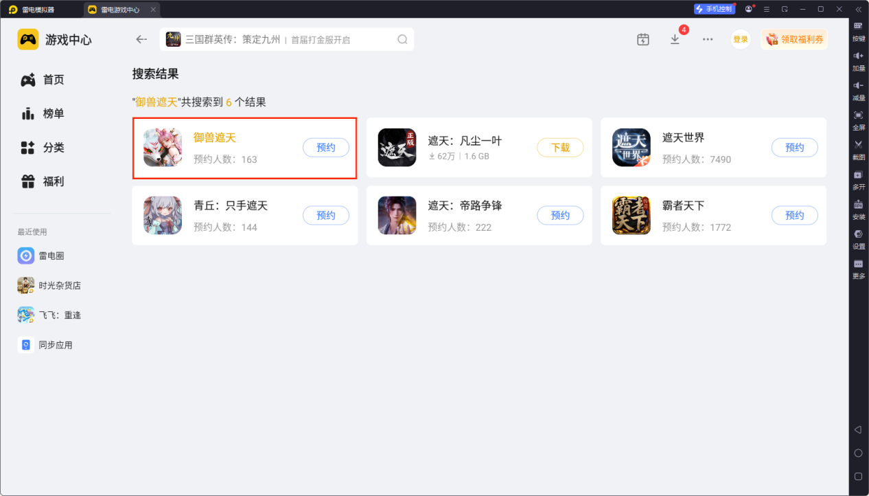 玩御兽遮天电脑版,小编给大家首推雷电模拟器,它对这款游戏的适配度高,运行稳定流畅。下载方式很简单:打开浏览器访问雷电模拟器官网,下载最新版本并安装。启动模拟器后,打开内置的“雷电游戏中心”,搜索“御兽遮天”,然后预约就可以了。