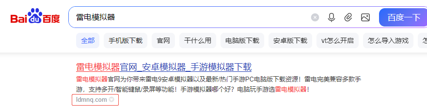 启动电脑自带浏览器,在顶部搜索栏输入“雷电模拟器”并执行搜索。需重点确认搜索结果中的官方域名ldmnq.com,点击进入官方网站后,在首页显眼位置找到“下载”按钮,点击即可。