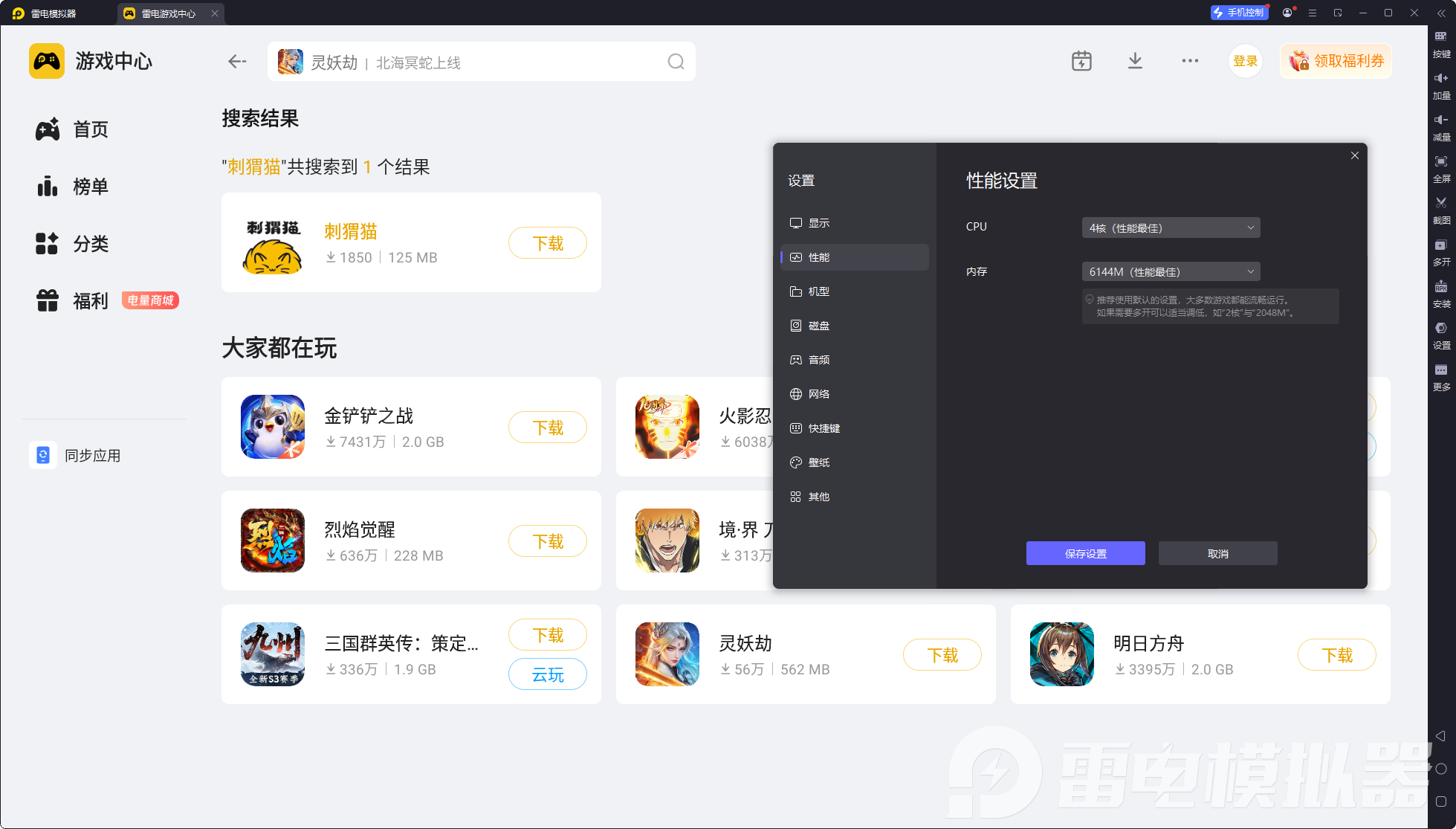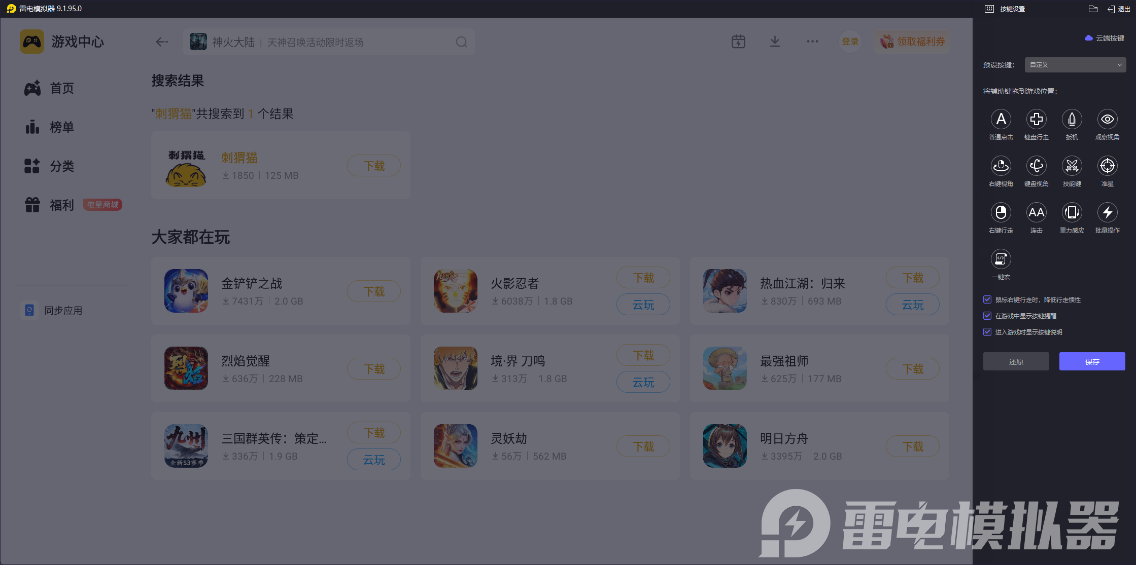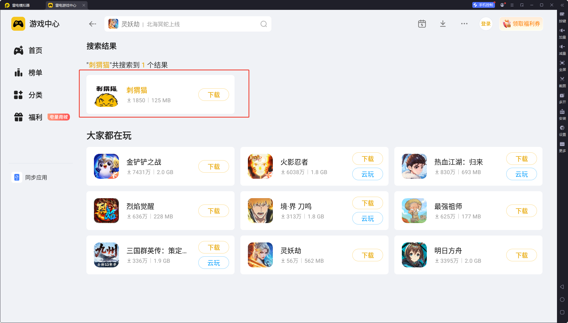 待下载安装成功后启动模拟器,在左侧功能栏中定位“雷电游戏中心”并点击进入,在搜索框输入“刺猬猫”,搜索结果加载完成后,点击对应应用的“安装”按钮,等待安装进度结束,就能在电脑上正常使用。