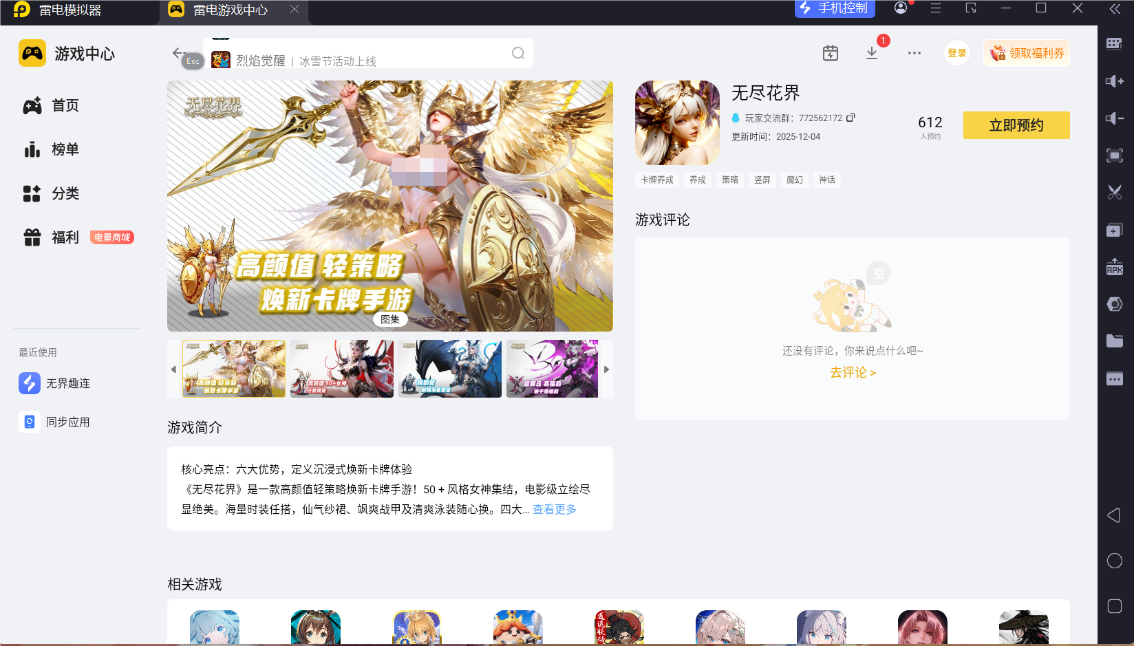 无尽花界模拟器是适配高颜值轻策略卡牌游戏《无尽花界》的电脑端工具,完美还原游戏核心玩法与沉浸体验。游戏以百位纯欲风女神收集养成、五大职业阵容搭配为核心,支持90%时间智能挂机,开局即送千抽福利,轻松解锁稀有角色与资源。无尽花界模拟器精准解决手机端操作、视野等痛点,下面带来游戏核心攻略与模拟器三大核心优势,让女神养成更高效。