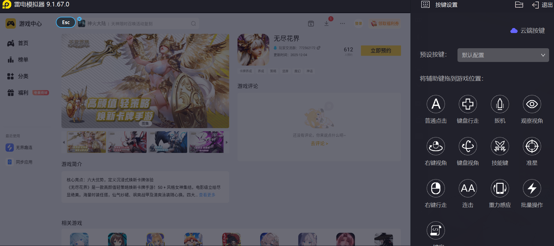 无尽花界模拟器支持自定义键鼠键位与预设云方案,可将女神技能释放、阵容切换、挂机启动等功能绑定快捷键。鼠标精准点击替代触屏滑动,大幅降低技能误触与阵容搭配失误概率,尤其适合对战中快速切换输出与辅助技能。