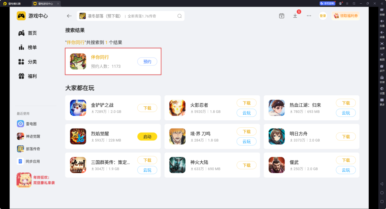 在这里小编推荐用雷电模拟器运行伴你同行电脑版,它能兼容Win7到Win11各类电脑系统,4G内存的老旧电脑也能流畅单开,核心功能全部免费,不用为基础体验付费。大家在下载好雷电模拟器后,打开模拟器内置的雷电游戏中心,找到该游戏点击预约,在游戏上线的时候就可以畅玩啦。