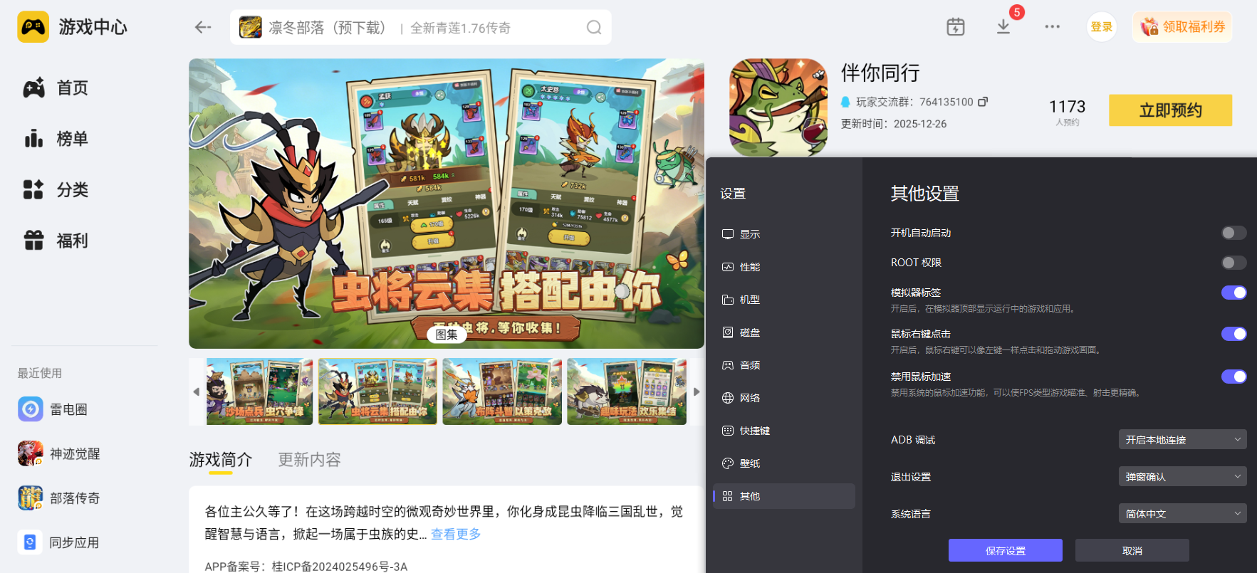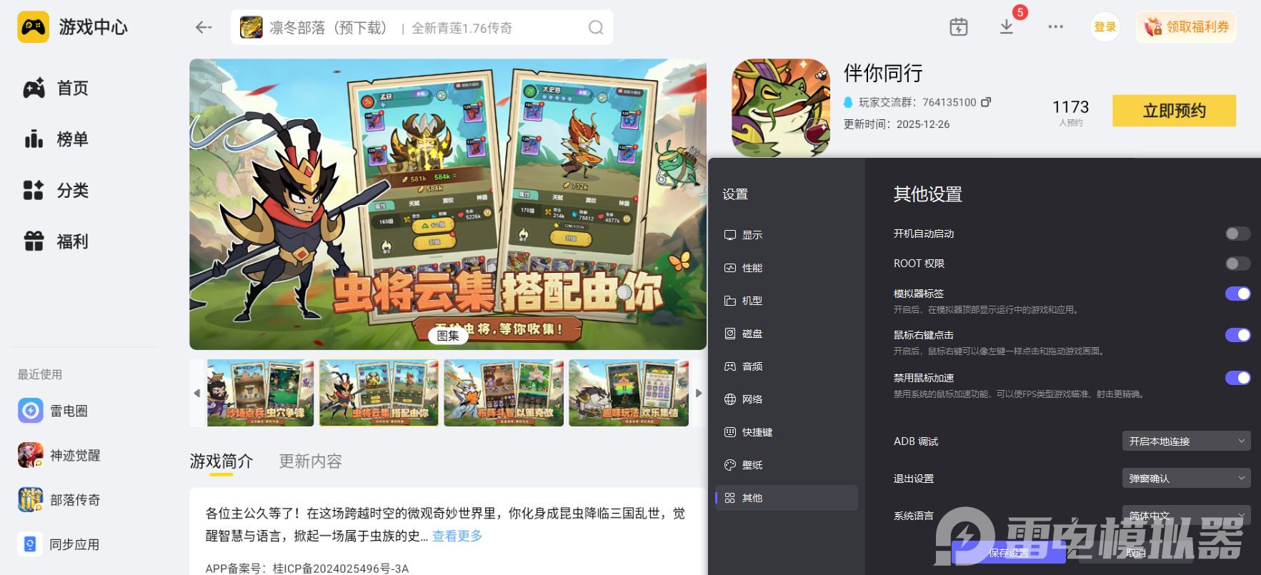 如果你也想解锁伴你同行电脑版的优质体验,雷电模拟器绝对是省心之选。不用再受手机电量、屏幕大小的限制,按照上面的步骤下载安装,就能在电脑上尽情探索昆虫三国的奇妙世界,和好友一起组队争霸,享受更畅快的游戏时光!