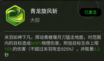 核心大招:青龙旋风斩,这是关羽的主要技能,拥有超高的技能倍率同时,还附带击退效果,无论是在竞技场还是副本推图,都是十分简单粗暴的输出方式。