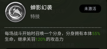 天赋三:蝉影幻袭,拓展了关羽的玩法,分身功能的增员作用使其在编队上更有性价比。