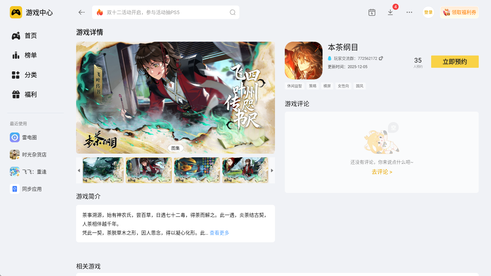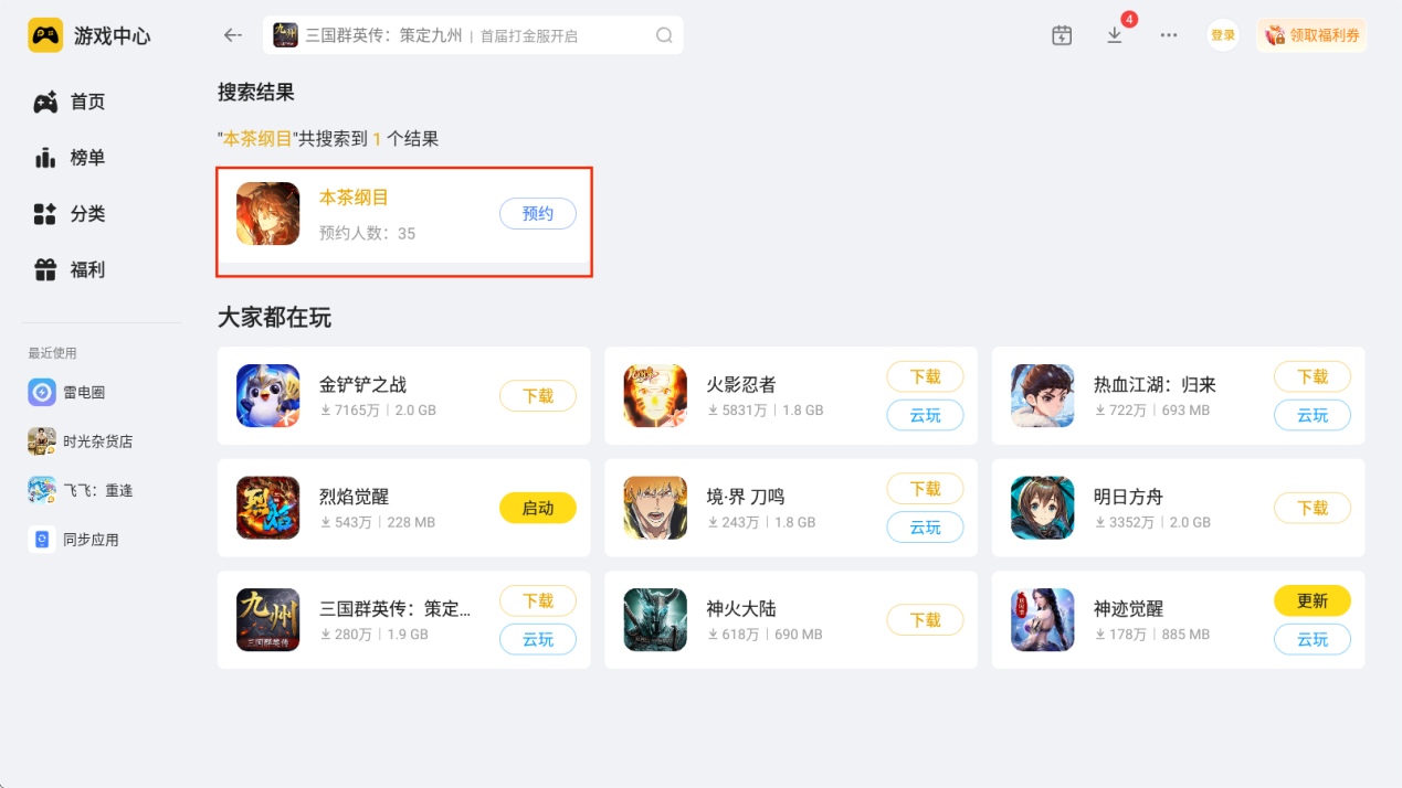 小编在这里推荐用雷电模拟器玩这款游戏,下载方式很简单,打开浏览器搜索“雷电模拟器官网”,进入官网下载最新版本并安装。打开已安装的雷电模拟器,在雷电游戏中心搜索框输入“本茶纲目”,找到对应游戏后预约即可。