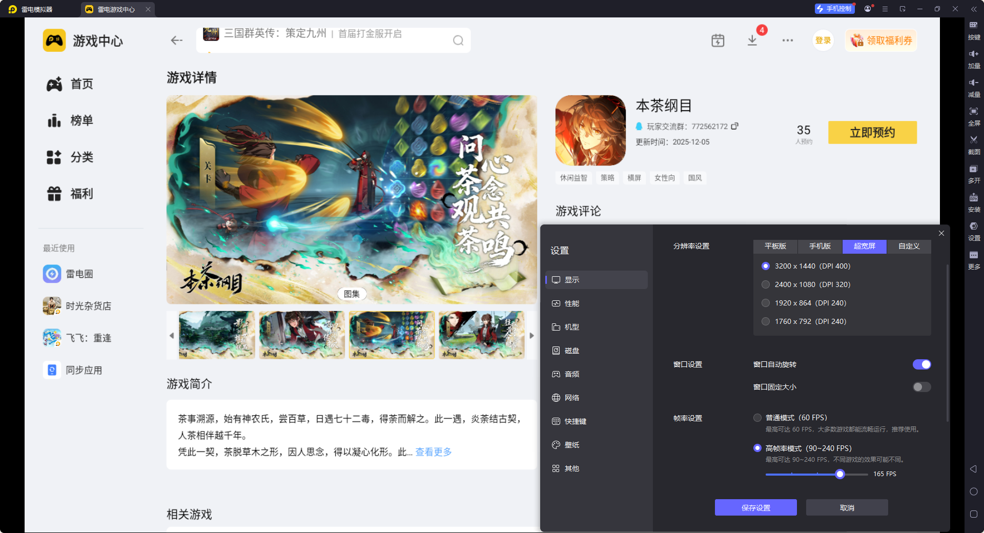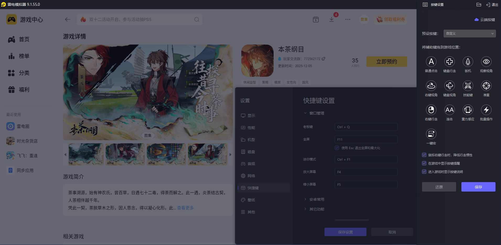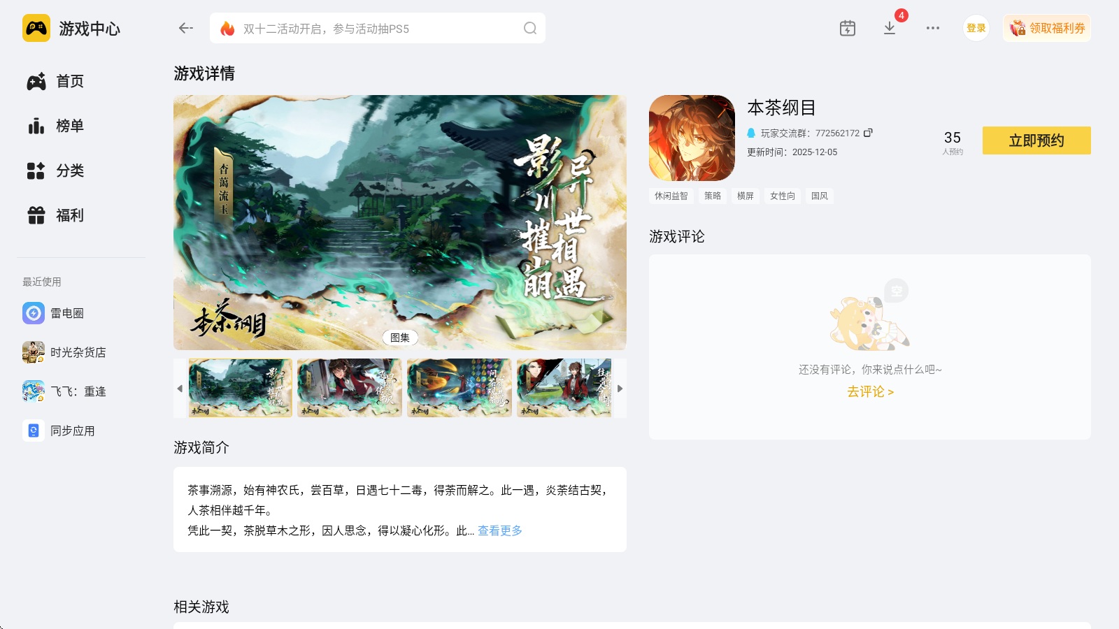 结合游戏特色,雷电模拟器是很合适的选择。大家在官网下载雷电模拟器,在内置应用中心搜索“本茶纲目”,找到游戏后点击预约,游戏上线的时候就会自动下载。